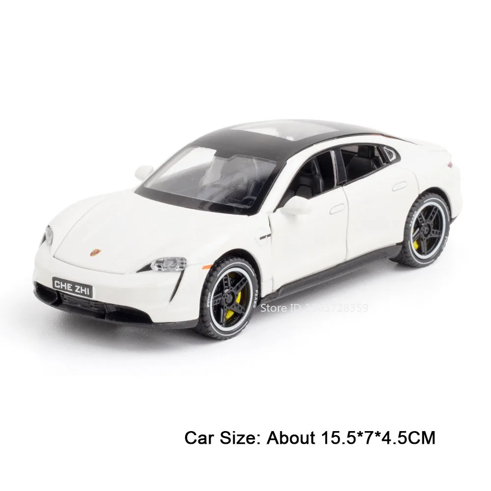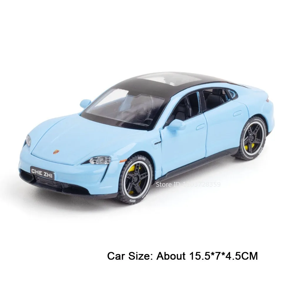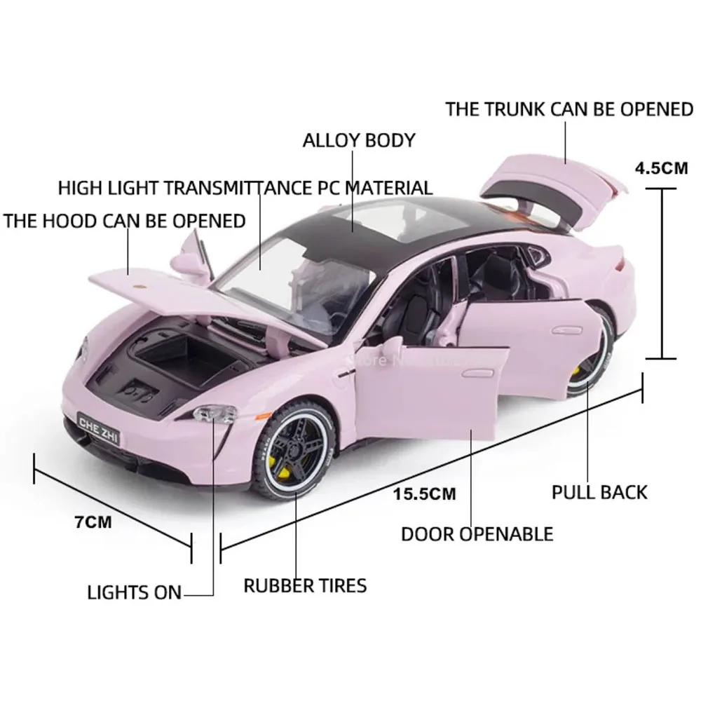 Experience exceptional realism with these 1:32 scale high simulation car models of the Macan and Taycan, crafted from durable metal alloy bodies, plastic chassis, and rubber tires. Measuring approximately 15*6.5*3.5 cm for the Macan and 15.5*7*4.5 cm for the Taycan, these detailed models feature opening doors, engine hoods, and trunks, along with sound and light functions activated by pressing the body. The pull-back propulsion system makes play effortless, while the exquisite craftsmanship and vibrant color options—such as blue, orange, black, red, white, and pink—bring these high-quality collectibles to life. Suitable for enthusiasts 14+, they make a perfect gift for display or play.