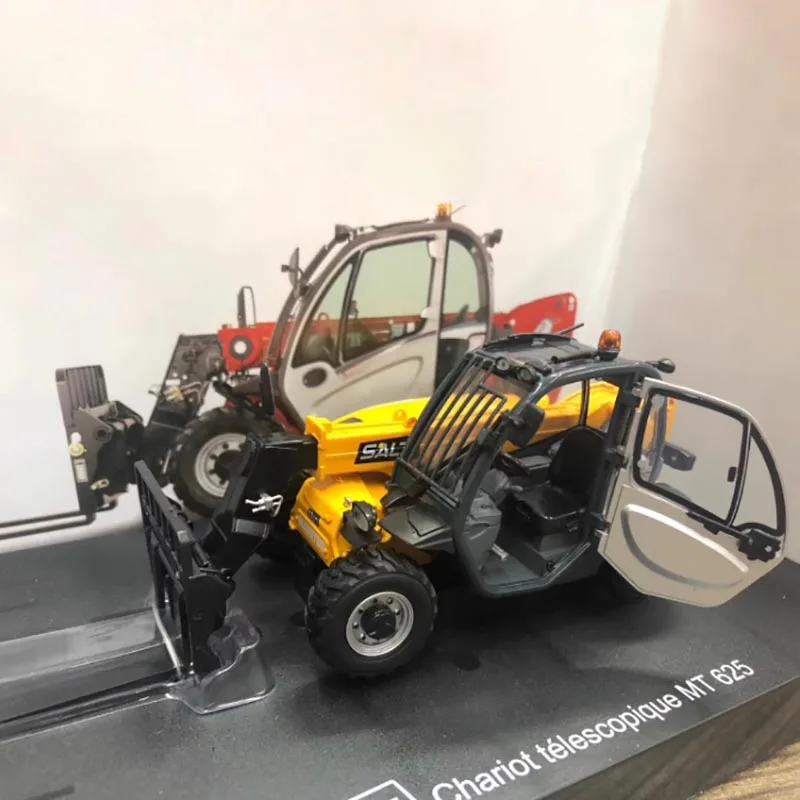 The UH5398 1:32 Manitou MT 625T telescopic arm front forklift is a stunning diecast engineering model that combines vibrant aesthetics with precise engineering. Painted in a striking yellow with gray accents, this masterpiece showcases smooth metallic textures and intricate details, like the molded grille and light fixtures. Constructed from alloy and plastic, this forklift boasts a durable design complete with robust wheels and treads, ideal for both display and light handling. The cabin features clear plastic elements that create a realistic look into its detailed interior. Presented on a classy black base titled “Chariot télescopique MT 625,” this model is perfect for adults looking to add a unique piece to their collection or enhance their décor.