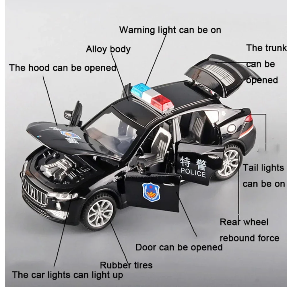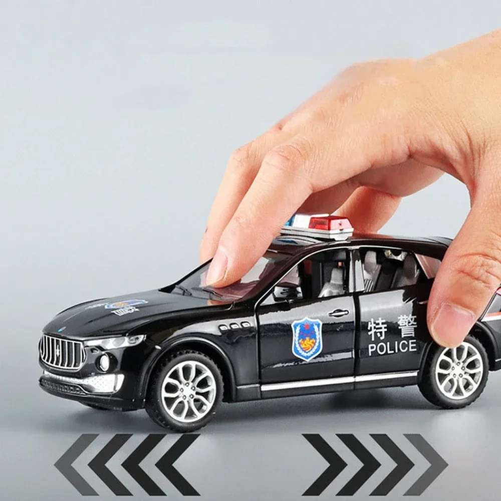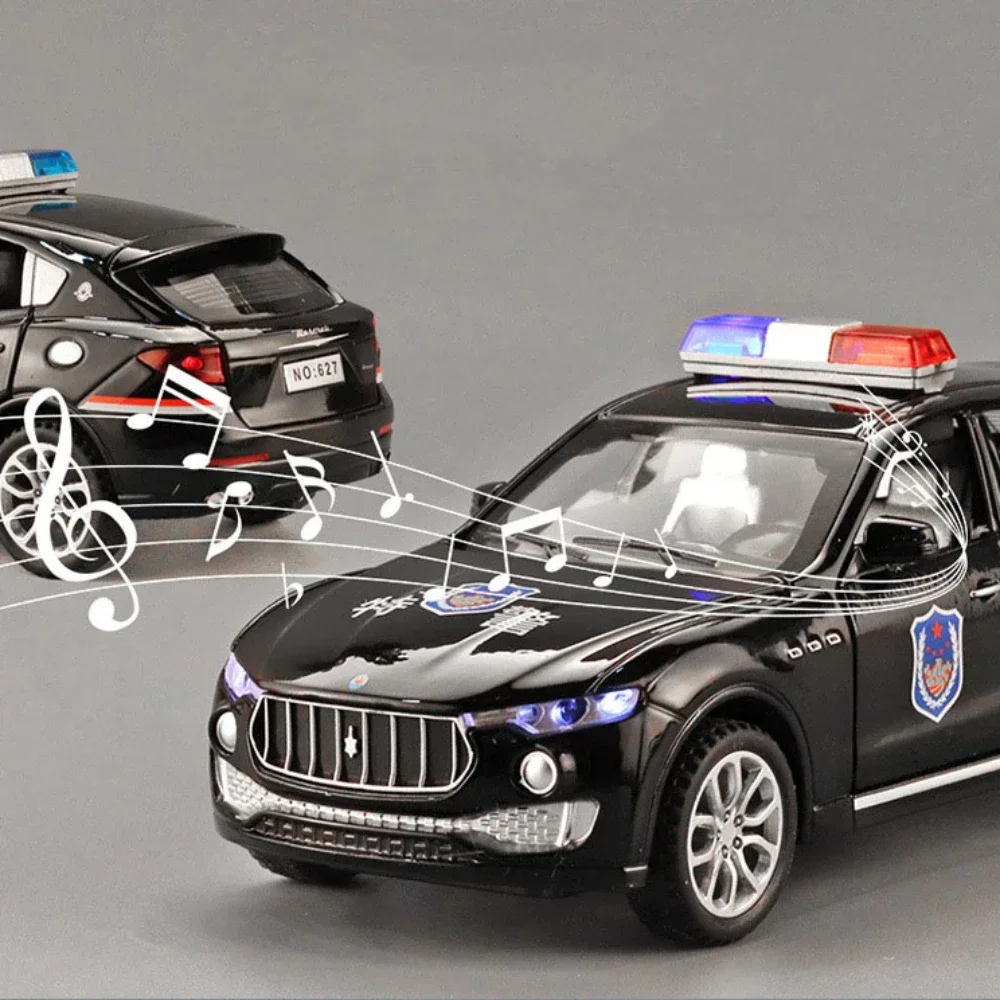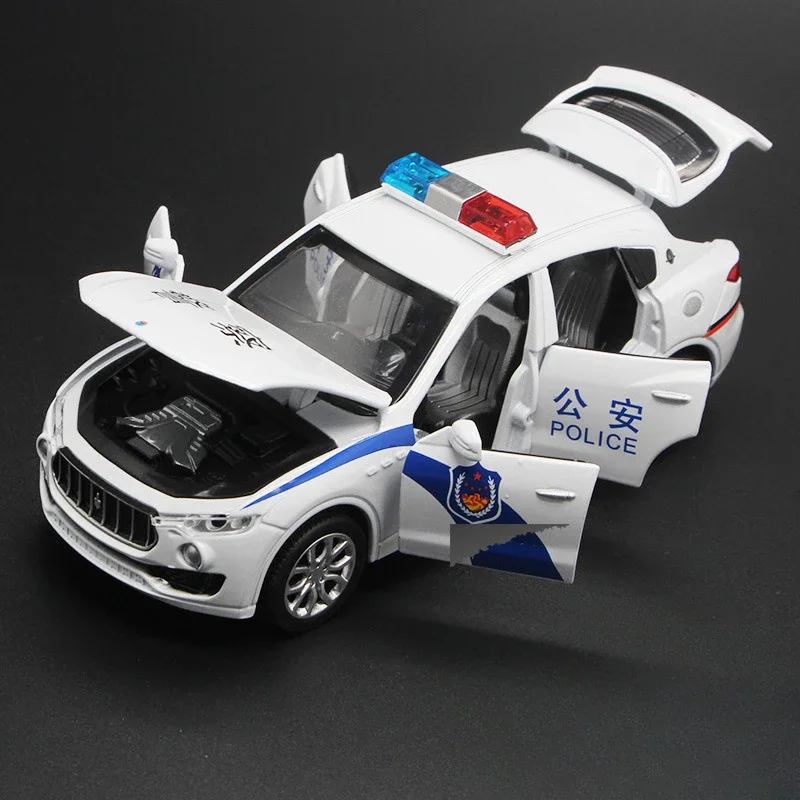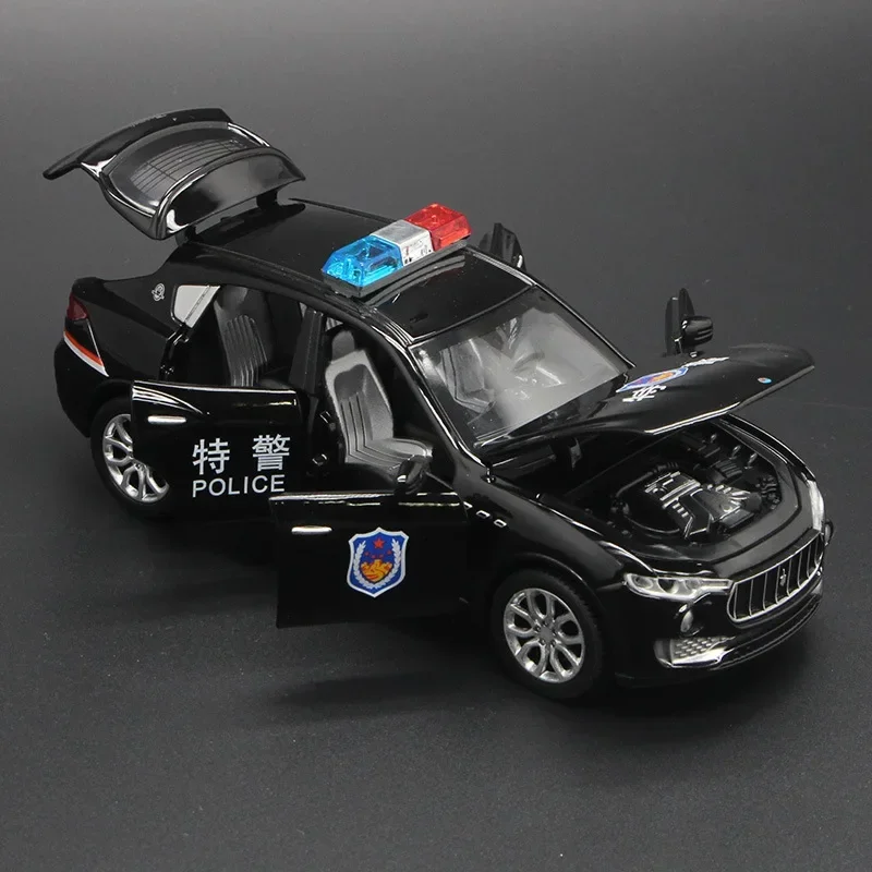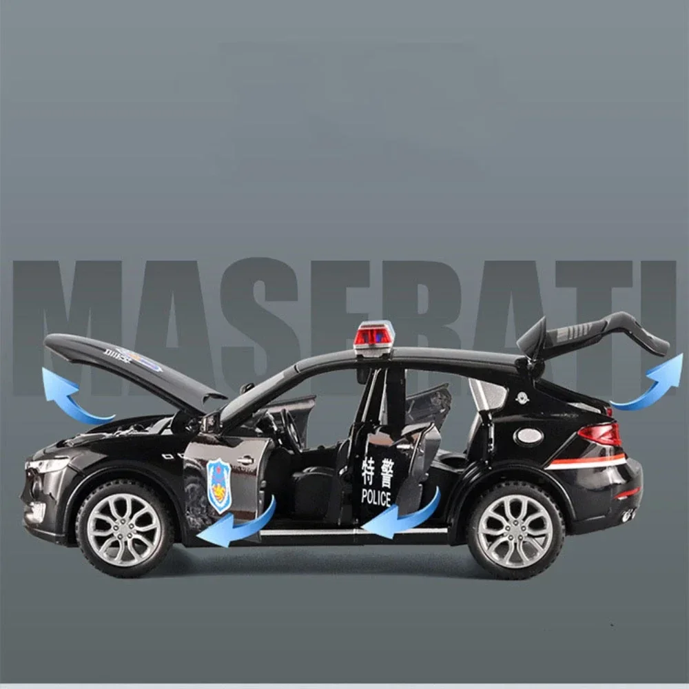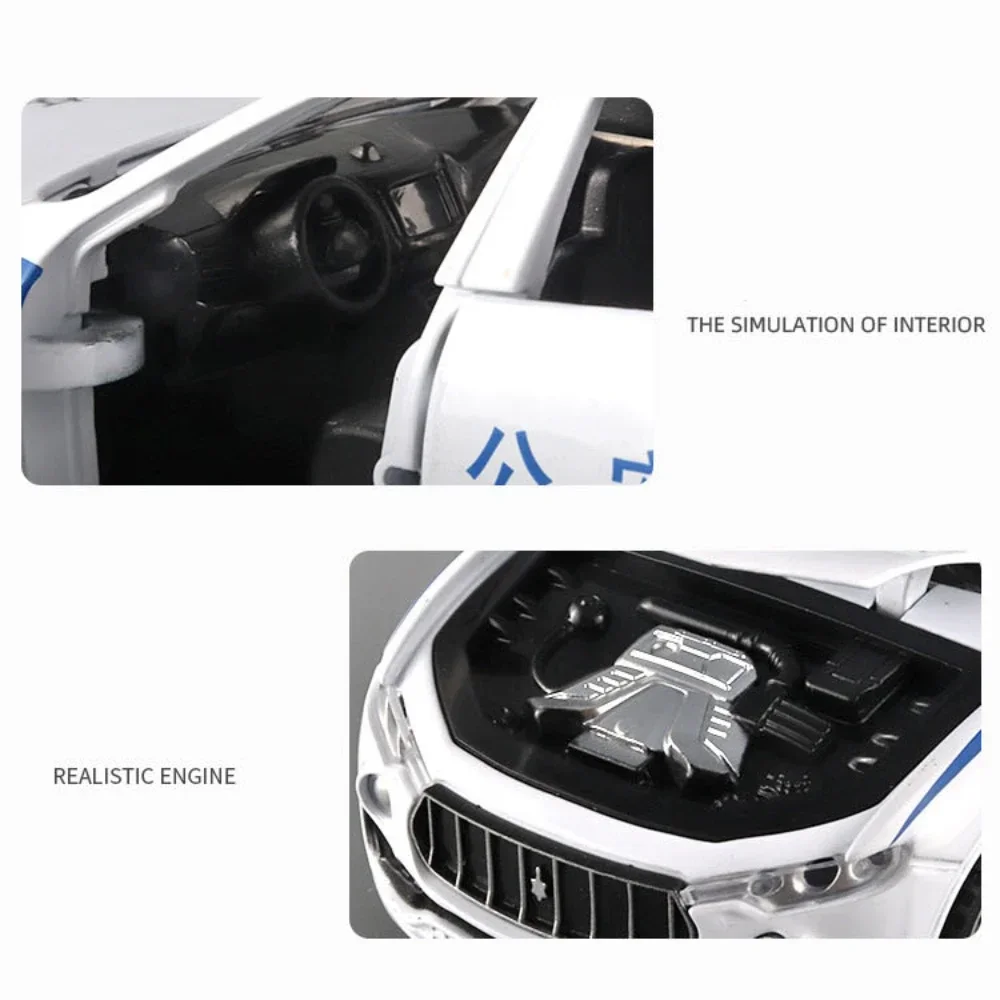 This highly detailed 1:32 scale diecast alloy Maserati Police SUV measures approximately 15.5 x 6 x 6 cm and features a sleek white or black finish. Crafted with a metal body, plastic chassis, and rubber tires, it boasts realistic details including an opening door, pull-back motion, and integrated lighting and music functions. The model captures the modern SUV silhouette with smooth curves, a distinctive front grille, clear headlight lenses, and a bold police light bar on top. Designed for collectors and enthusiasts aged 4 and above, it offers a dynamic, vibrant appearance that perfectly combines realism and functionality for an immersive display experience.