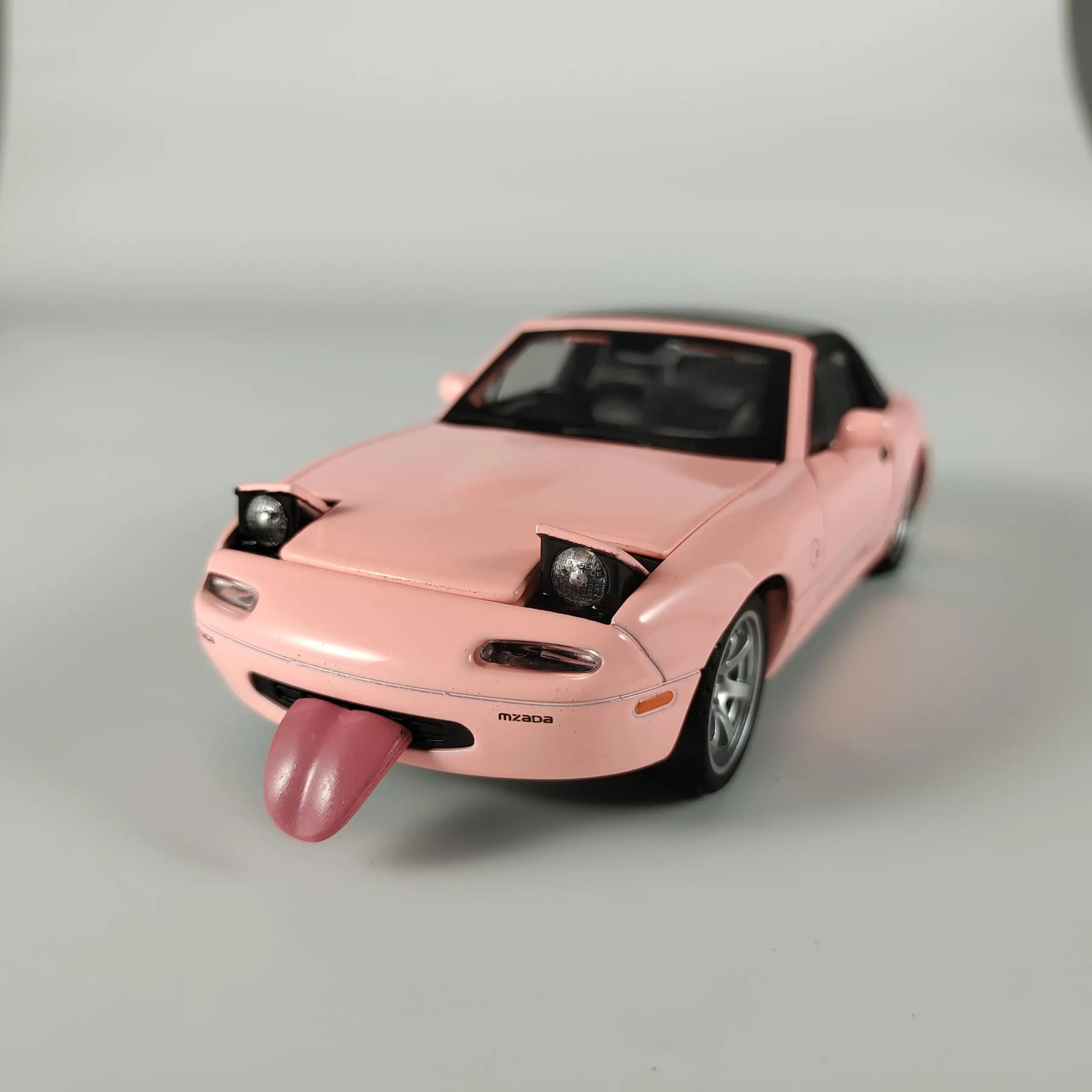 Step into the world of collectible cars with this beautifully crafted 1:32 scale diecast Mazda MX-5. Its aerodynamic coupe design features smooth, rounded contours that perfectly capture the sporty elegance of the original. Painted in a soft pink hue, the model stands out with a playful yet sophisticated appearance. The front showcases active pop-up headlights with black covers, complemented by a subtle sculpted bumper and a tiny black grille. The side profile reveals silver multi-spoke alloy wheels with black rubber tires, indented door handles, and black-painted molded side mirrors. Transparent windows reveal a simple but realistic black interior, making this model a true tribute to the iconic Mazda MX-5 while offering an engaging lighting and sound experience.