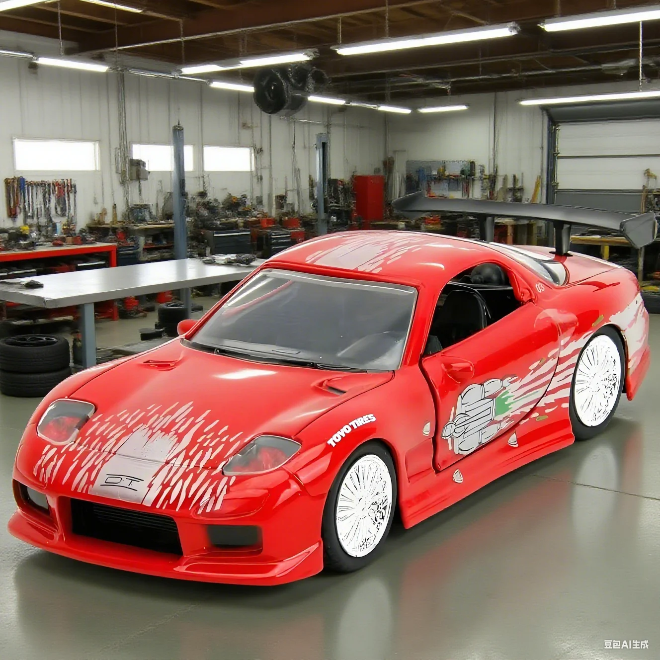This 1:32 scale diecast model of the Mazda RX7 from the Fast & Furious series features a vibrant red exterior with a glossy finish and striking white racing graphics. Measuring approximately 12 cm in length, it showcases smooth aerodynamic body lines, intricately designed white wheels, and a prominent black rear spoiler. The model includes openable doors and clear plastic windows for a detailed view of the interior, merging realistic craftsmanship with visual appeal. Constructed from durable alloy and plastic, this collector’s item is perfect for enthusiasts.