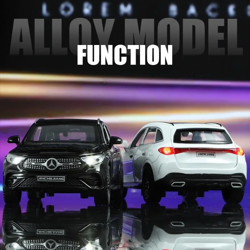 The 1:32 Mercedes-Benz GLC-400E diecast model car features a striking black exterior with a glossy finish, showcasing meticulous details that reflect the luxury of the actual vehicle. Constructed from durable zinc and ABS materials, this model boasts sound and light functions, enhancing its playability. Key highlights include realistic alloy-like wheels with textured rubber tires, intricately crafted interior details visible through transparent windows, and smooth curves that define its elegant silhouette. Perfect for collectors and as a stylish piece for home décor, this model is a sophisticated addition to any car enthusiast’s collection.