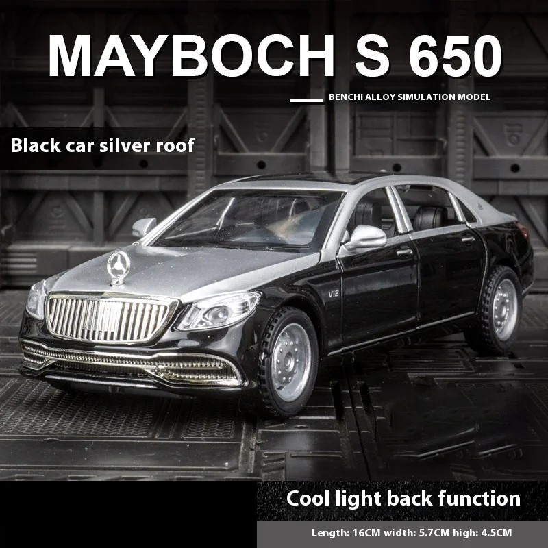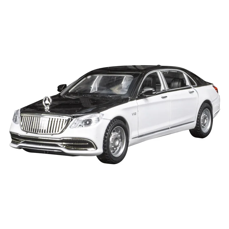 This 1:32 scale diecast model of the Mercedes Benz Maybach S650 exudes luxury with its sleek, realistic design. Crafted from metal, it features a sophisticated two-tone color scheme including white with a black roof, silver, black, and black and white options. The model showcases finely detailed elements such as a prominent front grille with vertical slats, chrome accents, precisely molded headlights with clear lenses, alloy-like rims with circular perforations, and transparent side windows revealing a detailed interior. It includes functional sound and light effects, making it an elegant addition to home decor or a premium gift for adult collectors.