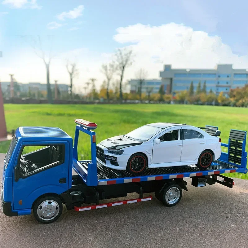 Experience the detailed realism of this 1:32 scale diecast Nissan alloy traffic road rescue wrecker model, crafted from sturdy alloy and plastic. Featuring a sleek white finish with contrasting black accents, this model showcases textured surfaces that mimic real metal and plastic. The streamlined cab has large windshield and side windows, topped with a vivid red light bar, while the flatbed includes a platform holding a low-profile, aerodynamic white sports car with tinted windows, detailed door handles, and side mirrors. Wheels have black tires with polished silver rims, emphasizing quality and precision. Perfect for display or gifting to adult collectors seeking high-quality, realistic replicas.