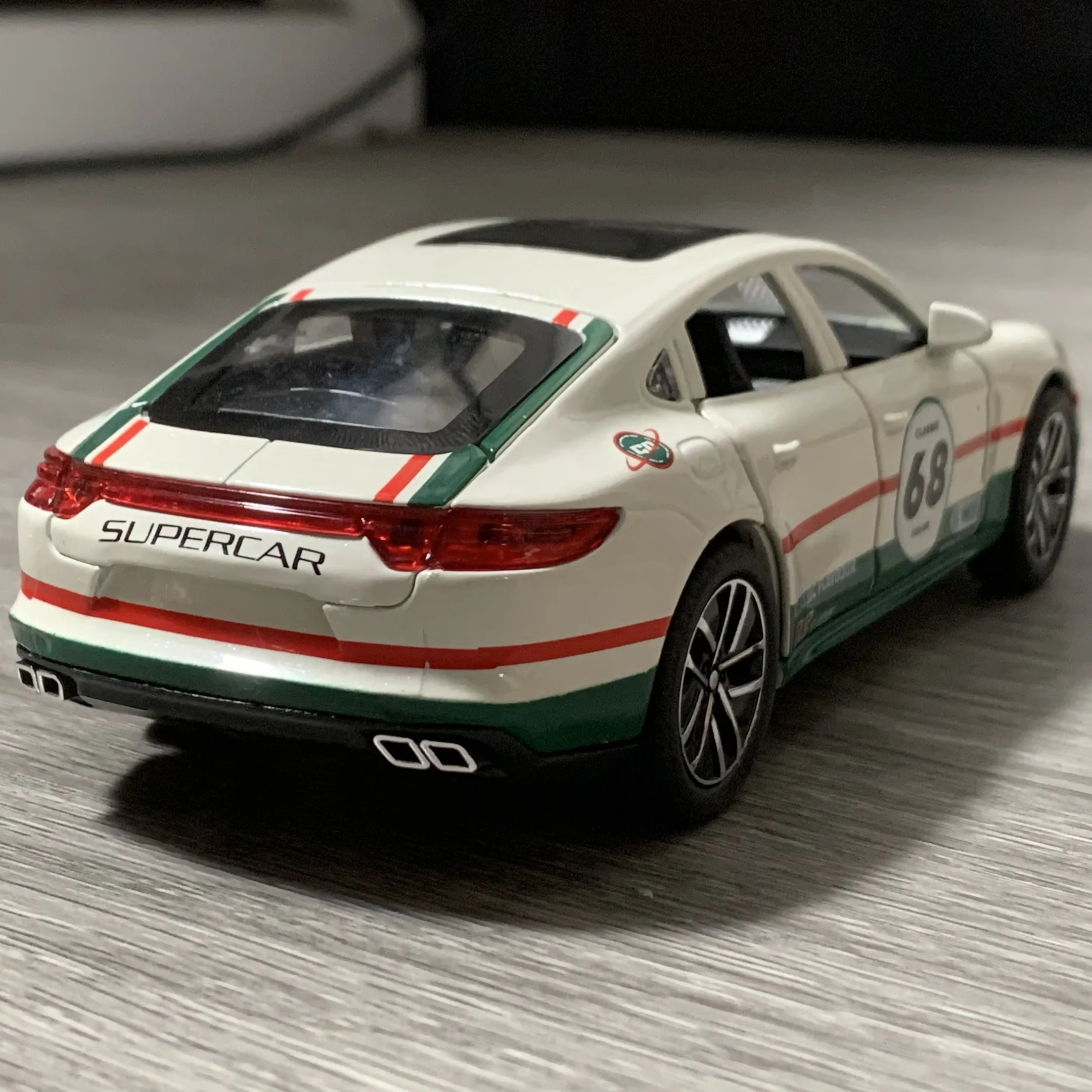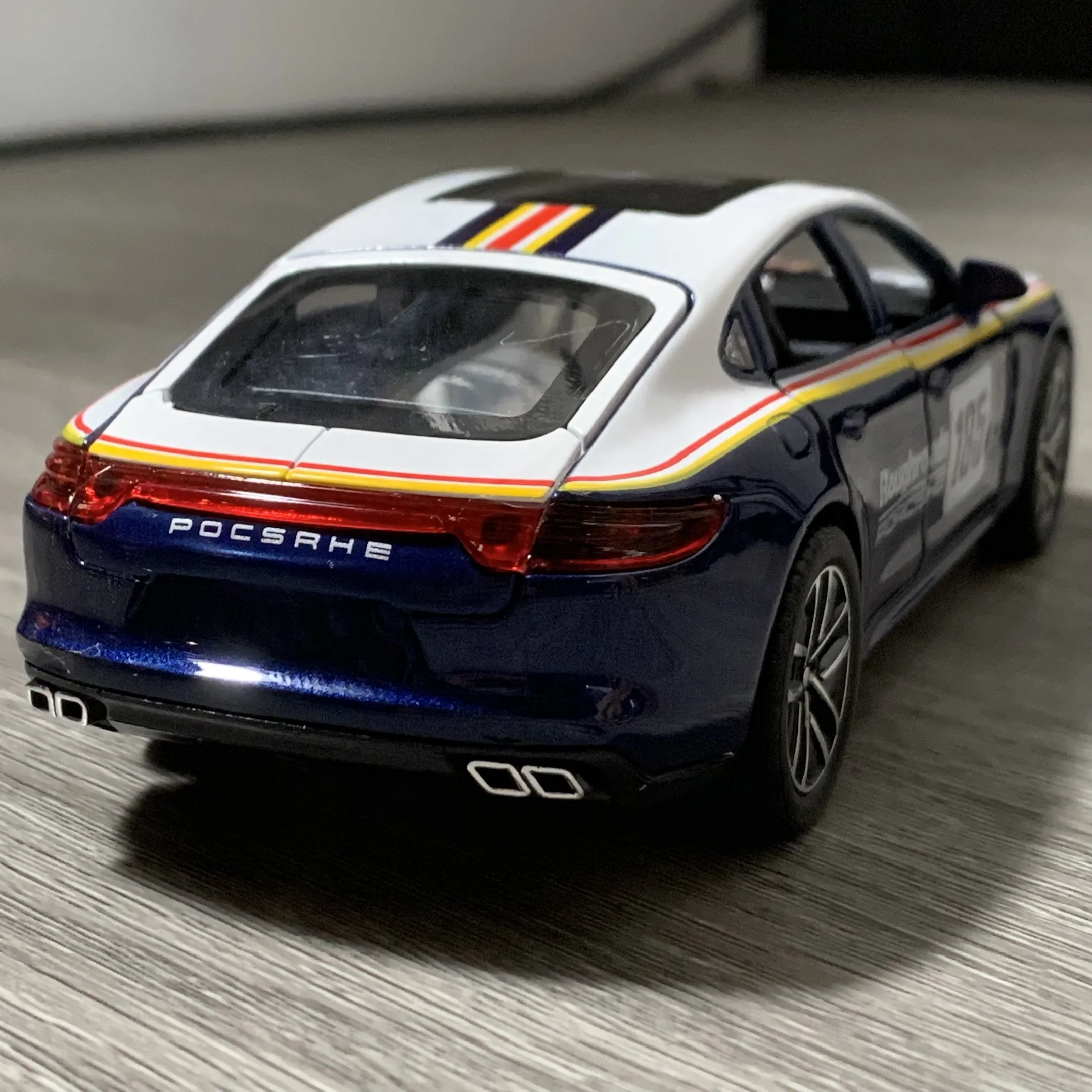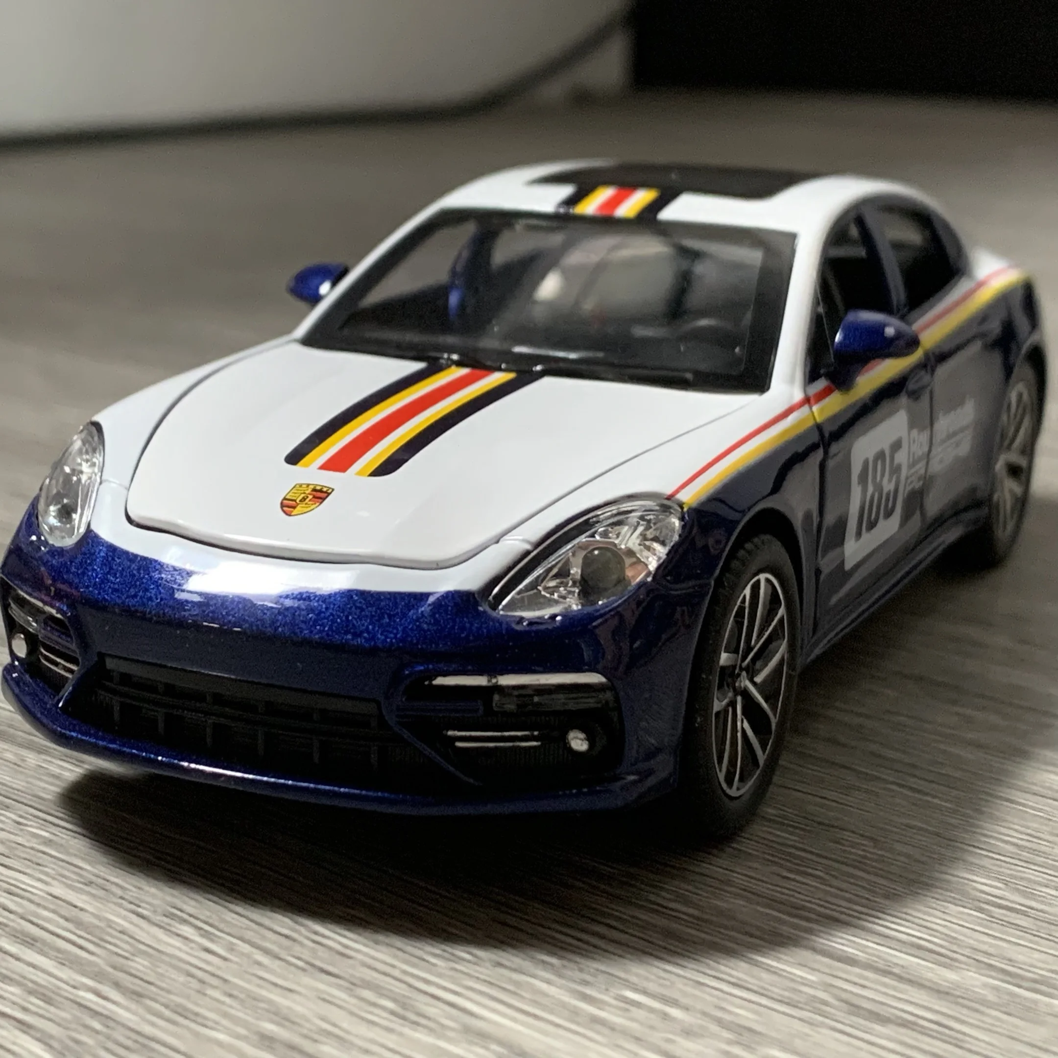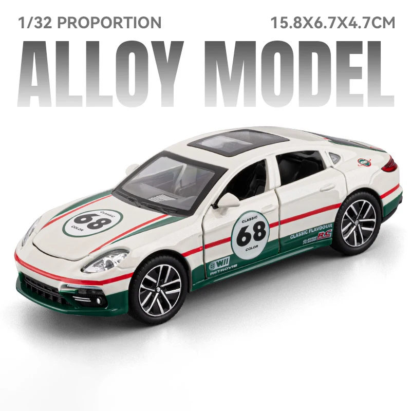 Experience the thrill of high-performance with this meticulously crafted 1:32 scale diecast alloy model of the Porsche Panamera Track Version sports car, available in vibrant blue and green colors. Designed with impressive attention to detail, it features a realistic aerodynamic shape, striking racing stripes, bold circular racing numbers, and detailed headlights and air intakes for an authentic look. Equipped with a convenient pull-back mechanism, this model combines collectible craftsmanship with dynamic play appeal for adult enthusiasts. Made from durable metal, it is free from harmful chemicals and perfect for showcasing or as a striking display piece, bringing the excitement of racing right into your collection.