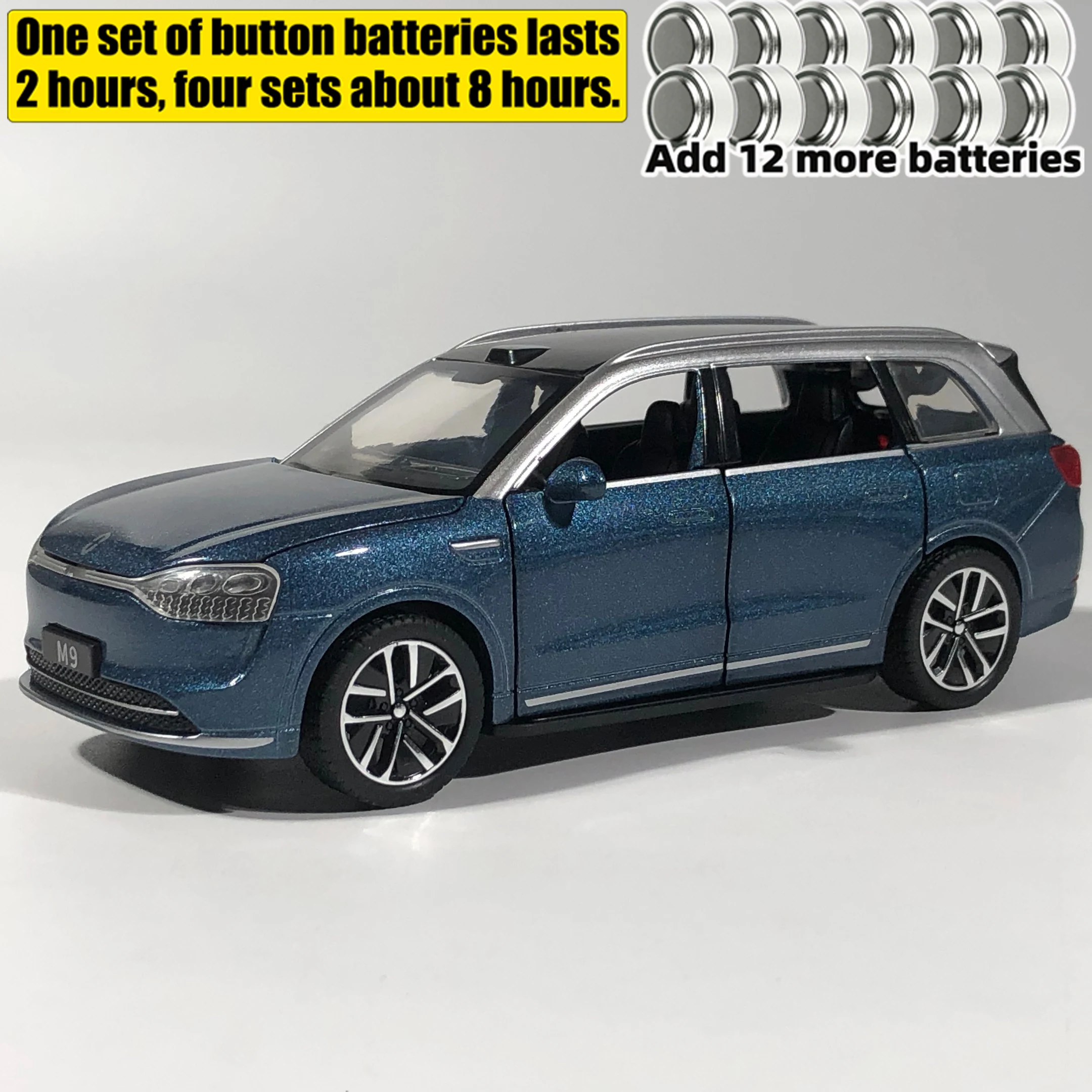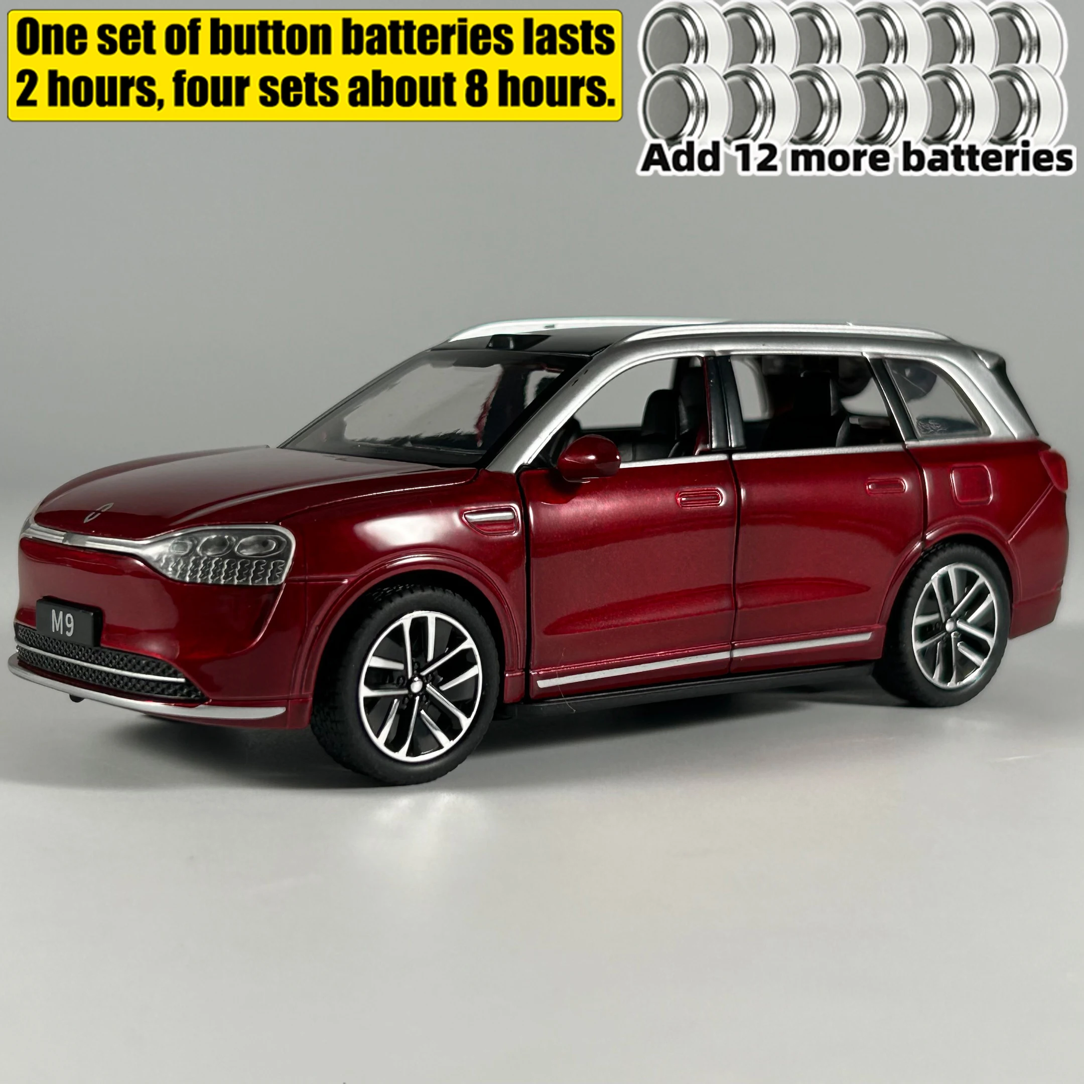 Experience the thrill of owning a miniature masterpiece with this detailed 1:32 scale AITO M9 SUV diecast model car. Crafted from high-quality metal, it replicates the modern elegance of the original with precise attention to detail. The sleek design features a striking two-tone color scheme, available in glossy black, vibrant red, or cool blue, with special variations including boxes and AG13 battery compartments. Its streamlined profile highlights smooth curves, sharp lines, and a realistic grille with clear LED headlight detailing. The model includes functional sound and light features operated through a pull-back mechanism, making it an engaging addition to any collection. Perfect for hobbyists, decorators, or as a thoughtful gift for enthusiasts.
