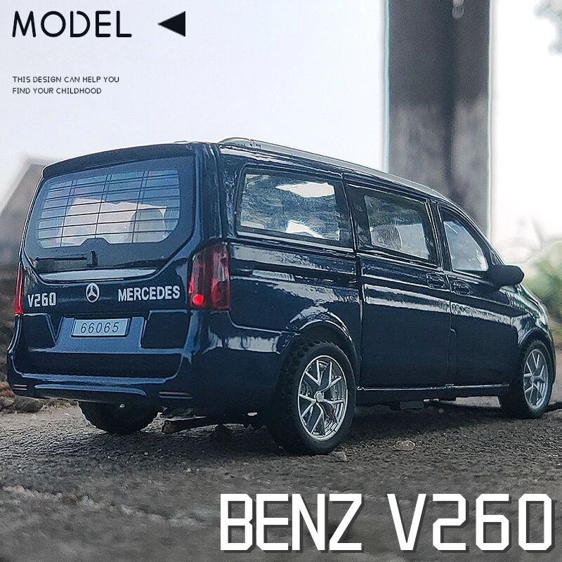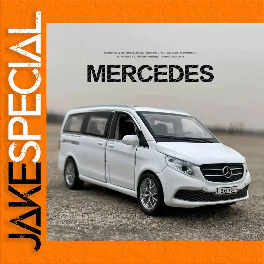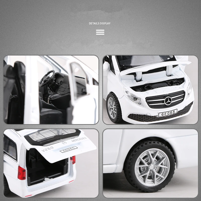 The 1:32 scale alloy MPV car model is a breathtaking diecast masterpiece finished in glossy white. This collectible vehicle showcases a stunning aerodynamic design with rounded edges, a prominent Mercedes-Benz logo, and intricately detailed headlights. With both front doors slightly ajar, the meticulously crafted interior is revealed for an immersive experience. Admire the chrome-colored alloy wheels paired with realistic black tires, and don't overlook the authentic license plate reading “66065.” Designed for enthusiasts and collectors alike, this model is perfect for display, featuring impressive sound and light effects, all while being durable due to its metal and plastic construction.