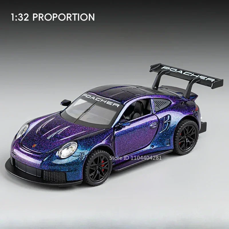 Step into the world of high-performance racing with this meticulously crafted 1:32 scale alloy model of the Porsche GT3RS. Its sleek black, blue, purple, white, or pink finish reflects light beautifully, highlighting the smooth, aerodynamic body. Every detail, from vented front bumper to the bold rear wing spoiler with “PERFORMANCE” inscription, emphasizes its sporty essence. Transparent windows reveal an intricately detailed interior, while small, durable rubber tires with realistic black rims complete the authentic appearance. This diecast model isn’t just a display piece; it features functional doors that open, a pull-back motion mechanism, and built-in sound and lighting effects powered by included batteries. Elevate your collection with this passion-driven masterpiece.