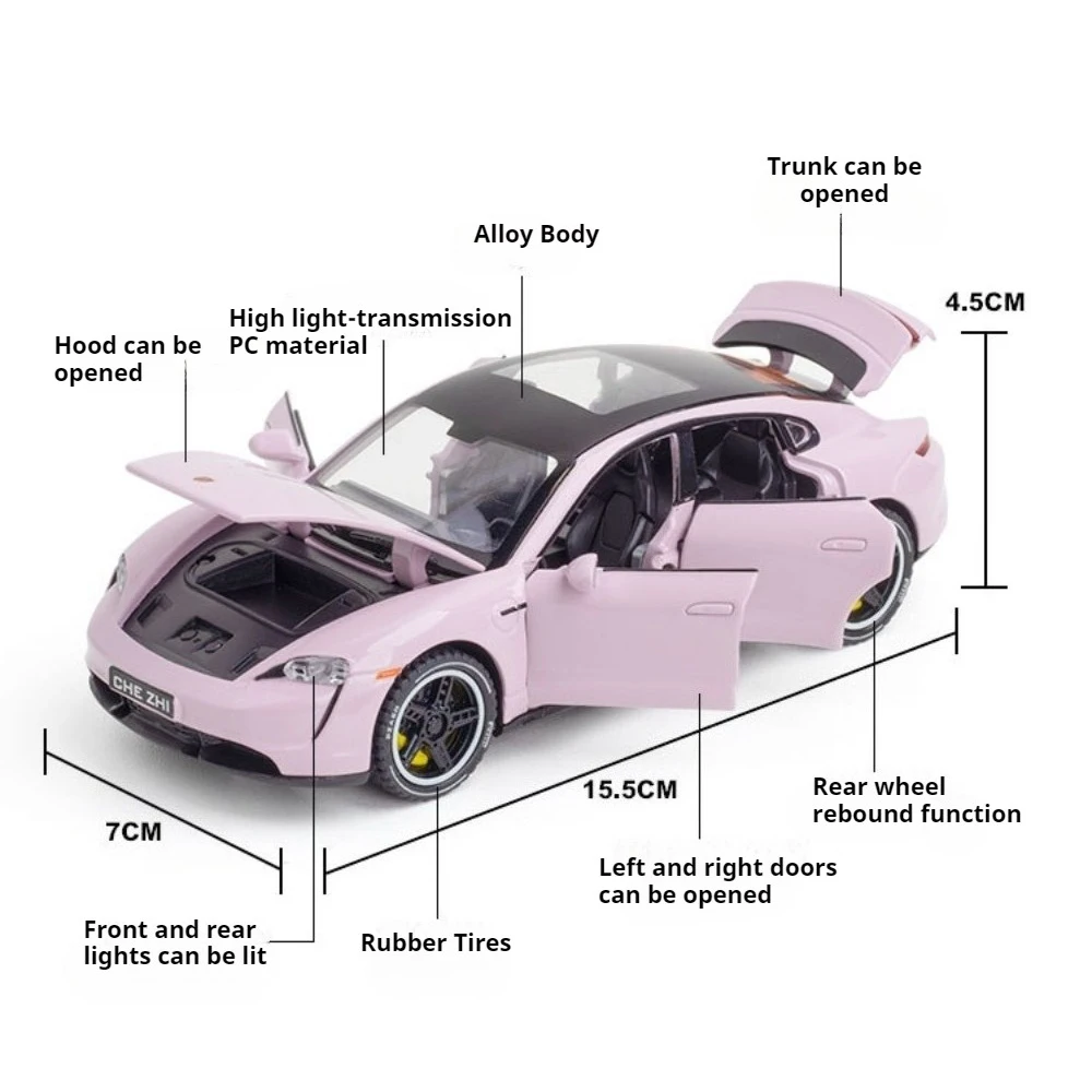 Experience the thrill of owning a sleek, high-performance sports car with this detailed 1:32 scale model. Crafted from durable diecast metal with a plastic chassis and rubber tires, it captures the essence of modern speed and elegance. The bright, vibrant colors—such as striking blue and fiery red—make it a standout piece for collectors or as a dynamic toy. The model features realistic doors that can be opened to reveal an intricately designed interior, enhancing its lifelike appeal. Equipped with pull-back mobility, sound effects, and LED lighting, it provides an immersive experience that excites both kids and enthusiasts alike. Perfect as a gift, collection piece, or playful display, this model combines craftsmanship with interactive fun.