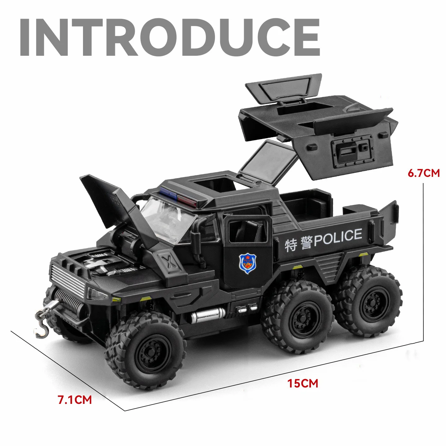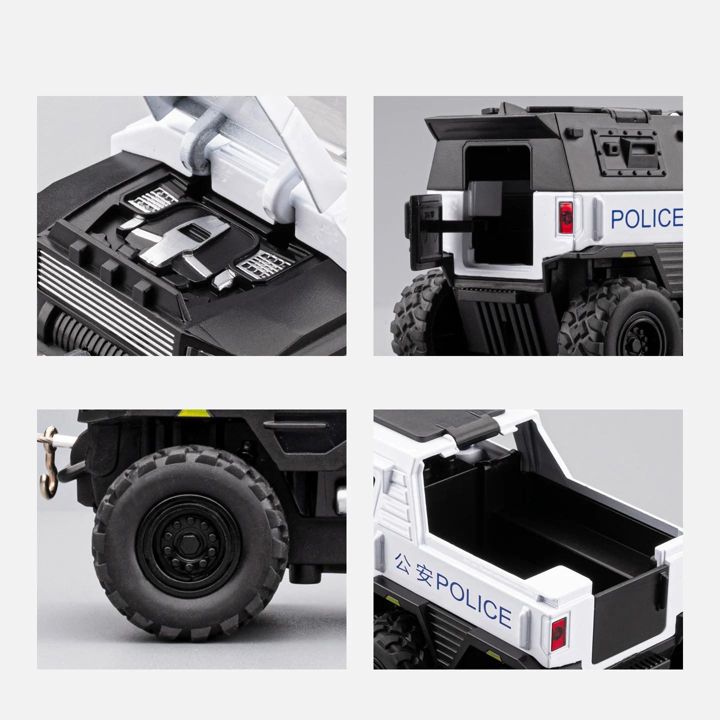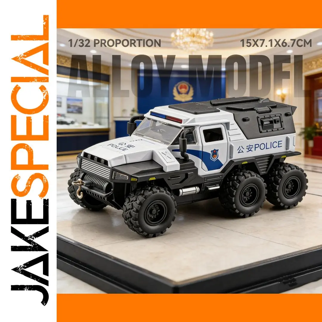 - Scaled accurately at 1:32, with dimensions approximately 15×7.1×6.7 cm, resembling real-life armored police units with finely detailed features like textured tires and horizontal grille lines.
