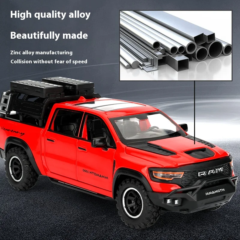 This highly detailed diecast model of the Dodge RAM 1000 TRX is crafted from durable alloy and scaled at 1:32, capturing every feature of the rugged full-sized truck. It boasts a glossy black finish with a bold front grille displaying RAM branding, clear headlights with subtle orange accents, and a textured bumper with skid plates. Realistic side mirrors and door handles, textured cargo bed with roof racks, and large off-road tires with deep treads on multi-spoke black rims enhance its authentic appearance. Equipped with functional sound and light modules that deliver dynamic lighting effects and realistic sounds, this model is a perfect collector’s item or display piece for enthusiasts.