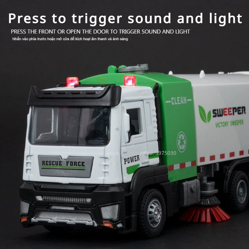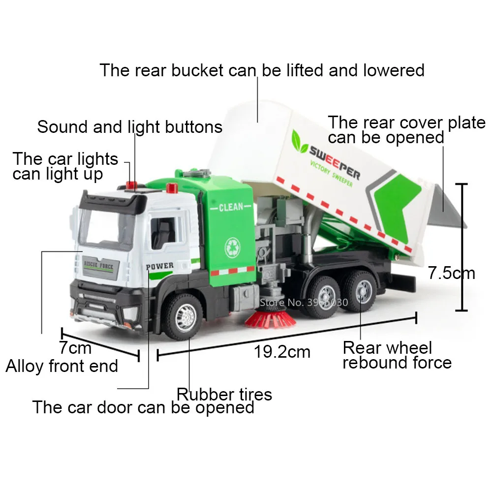 Step into a realistic urban environment with this meticulously crafted 1:32 scale city sanitation sweeper. Featuring a sleek white metal body accented by vibrant green details, it captures the essence of modern eco-friendly vehicles. The detailed cab showcases a realistic windshield, side windows, and a black grille with headlights, adding lifelike depth. The large green side panel with “CLEAN” text and recycling symbols emphasizes its purpose. At the rear, a sizable container with green arrows and stripes suggests motion and efficiency. The rubber tires with detailed hubcaps offer a polished, authentic look, while the red semi-circular sweeping brush underneath showcases its operational design. Perfect for collectors or imaginative play, this model combines style and function flawlessly.