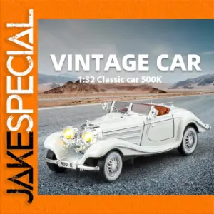 This exquisite 1:32 scale model of a vintage automobile is crafted from durable zinc alloy, weighing 0.45 kg. It features a polished white exterior with flowing lines, gleaming chrome accents, and chrome headlights with a yellow tint, embodying classic car design. The detailed interior showcases rich brown leather textures visible through the open convertible, while the vintage wheels with a classic spoke pattern enhance its authenticity. Available in multiple colors including purple, red, black, and white, this high-end fun ornament is perfect for decorating your car center console or as a thoughtful gift for car enthusiasts.