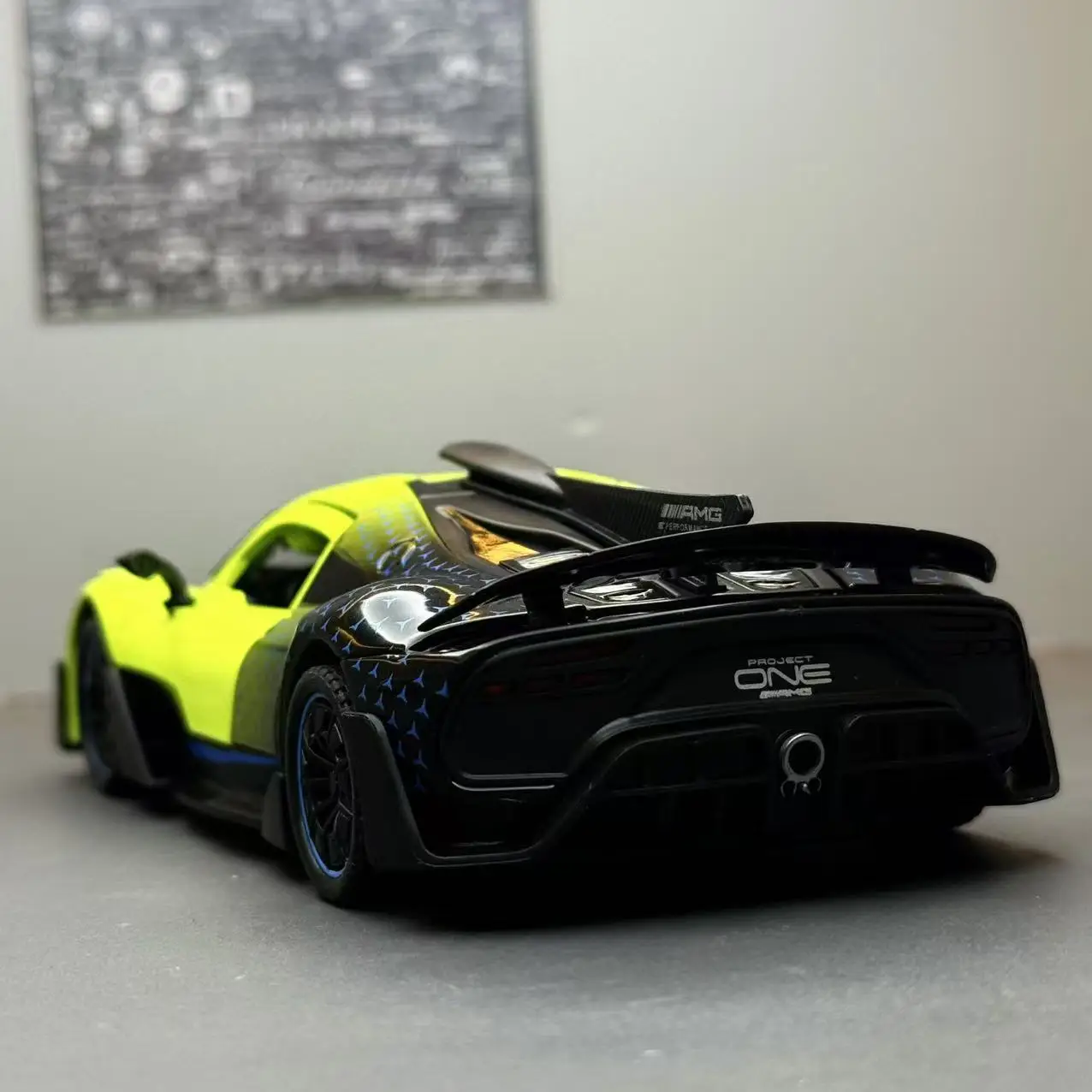 This finely detailed die-cast model of a supercar, scaled at 1:32, is a captivating addition to any collection. Dressed in a striking neon yellow finish, it showcases aerodynamic curves and aggressive styling that will impress enthusiasts. The front is adorned with sleek LED-like headlights, adding a contemporary touch. The textured black hood hints at high performance while the clear windshield reveals a sophisticated dark interior accented with blue details. The fully equipped rear features an eye-catching spoiler, intricate taillights, and sporty exhaust pipes. Activate the sound features via the button battery to bring this model to life. Perfect for display or as a gift, let this supercar spark your passion for high-speed automobiles.