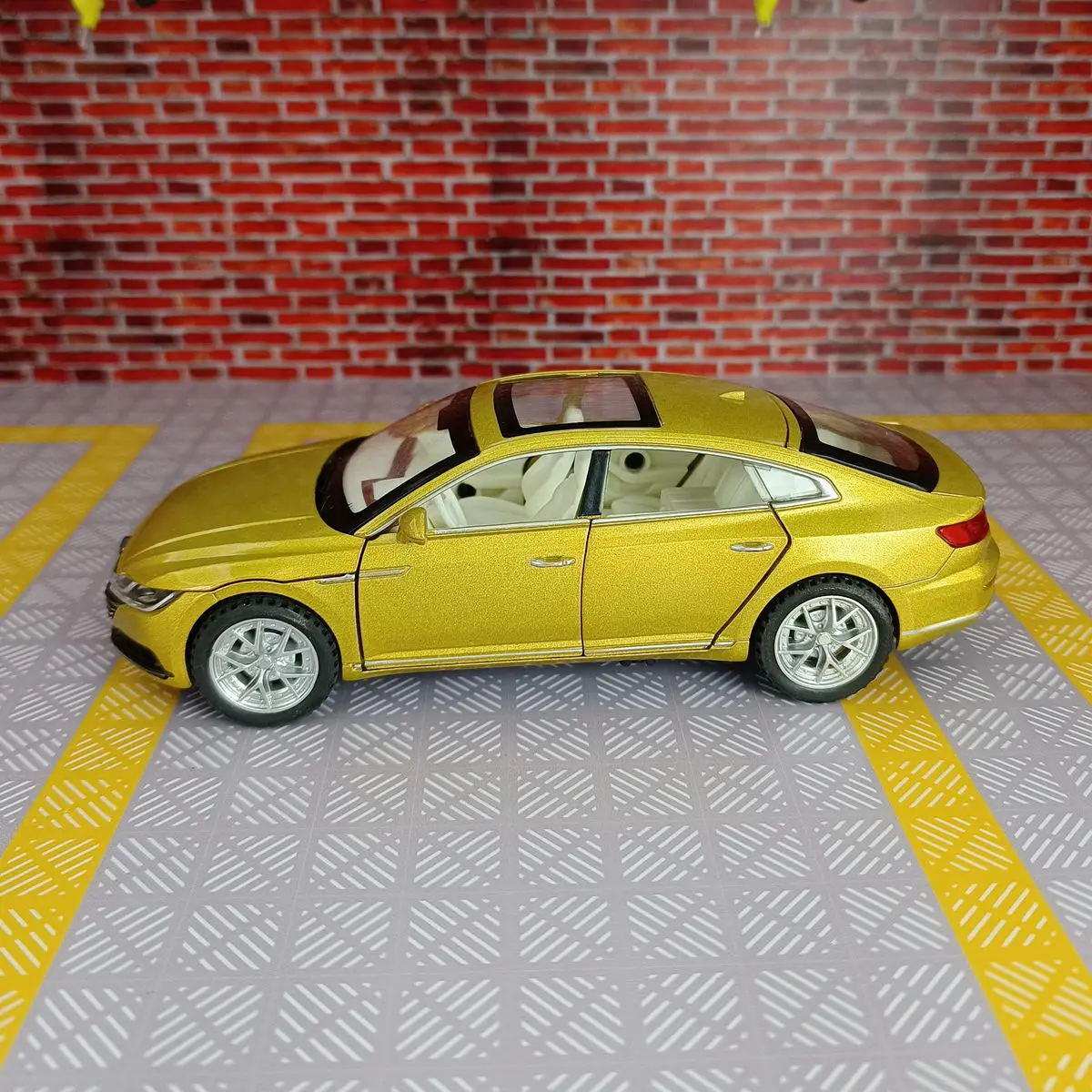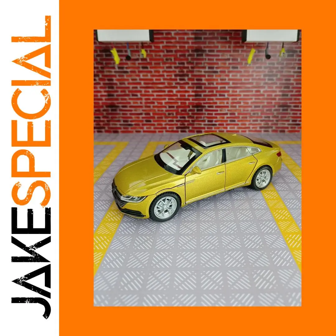 Immerse yourself in the world of luxury miniature automobiles with this meticulously crafted 1:32 scale diecast alloy model car. Featuring a sleek metallic gold finish, it captures the essence of a modern, high-end sedan with smooth and streamlined contours. The black panoramic glass roof contrasts beautifully with the shiny body, while the detailed grille, sharp headlights, and chrome accents enhance its realistic appearance. Transparent windows reveal an intricately designed interior, complete with dashboard, steering wheel, and seats. The silver alloy rims with multi-spoke design paired with rubber tires give it a robust and authentic look. Whether for display, collection, or a gift, this model car exudes elegance and craftsmanship, making it a must-have for enthusiasts and collectors alike.