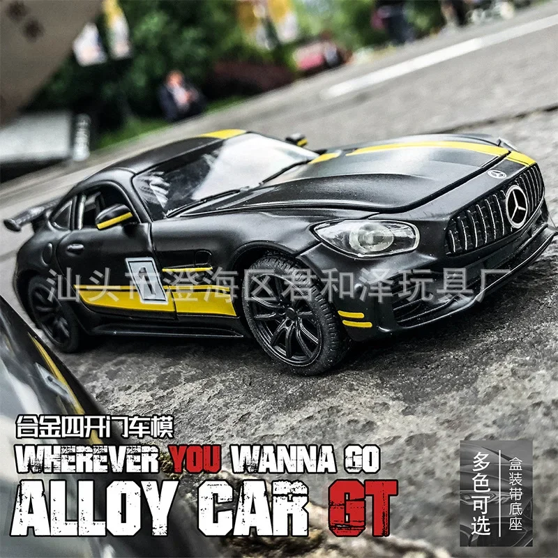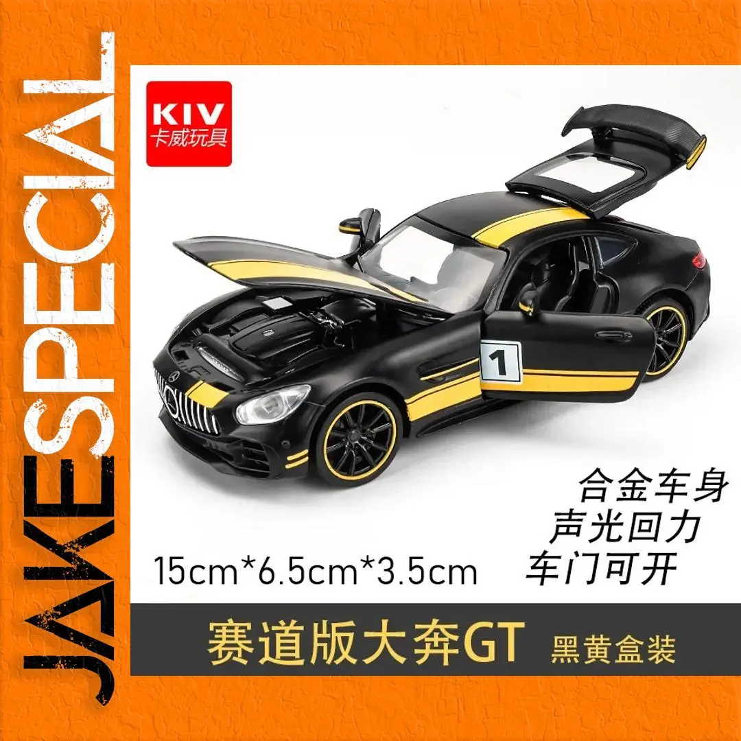 This 1:32 scale diecast alloy model car is a stunning representation of a supercar, featuring a sleek matte black finish accented with bright yellow racing stripes for a striking look. Detailed grille and headlights lend realism, while black wheels with yellow accents enhance its sporty appeal. The model includes functional features such as an opening hood revealing intricate engine details and an opening passenger door. Measuring approximately 15 cm in length, 6.5 cm in width, and 3.5 cm in height, this durable metal vehicle is perfect for collectors and enthusiasts, available in colors like black/yellow and black/red, with boxed or nobox options.