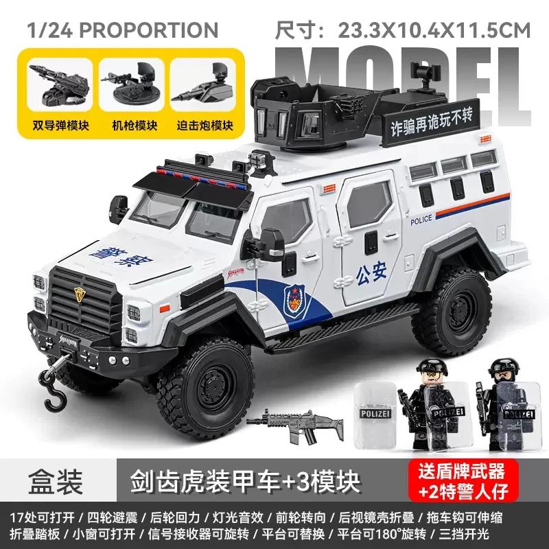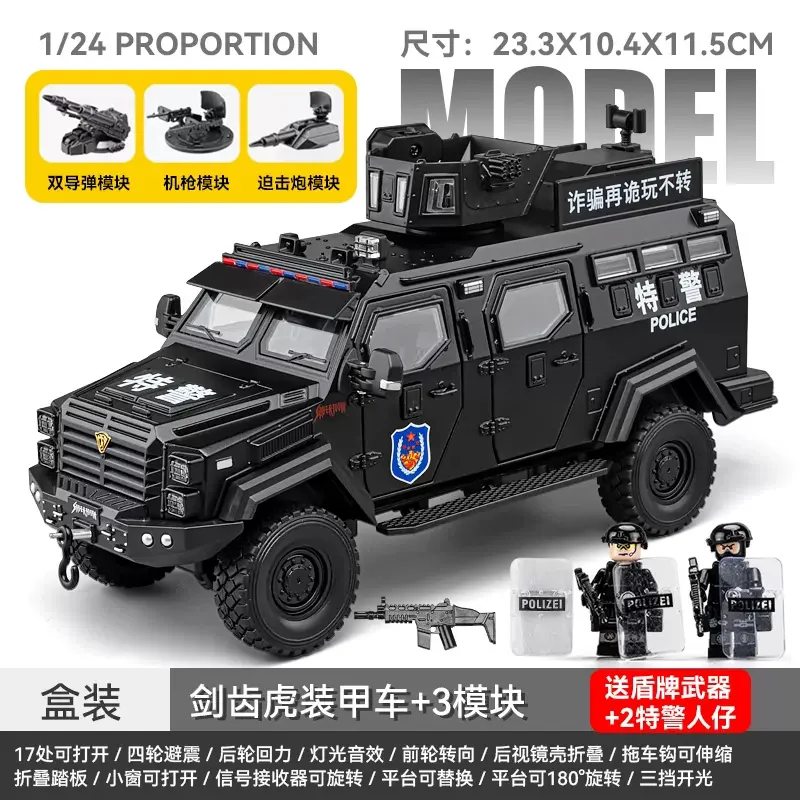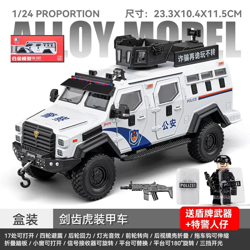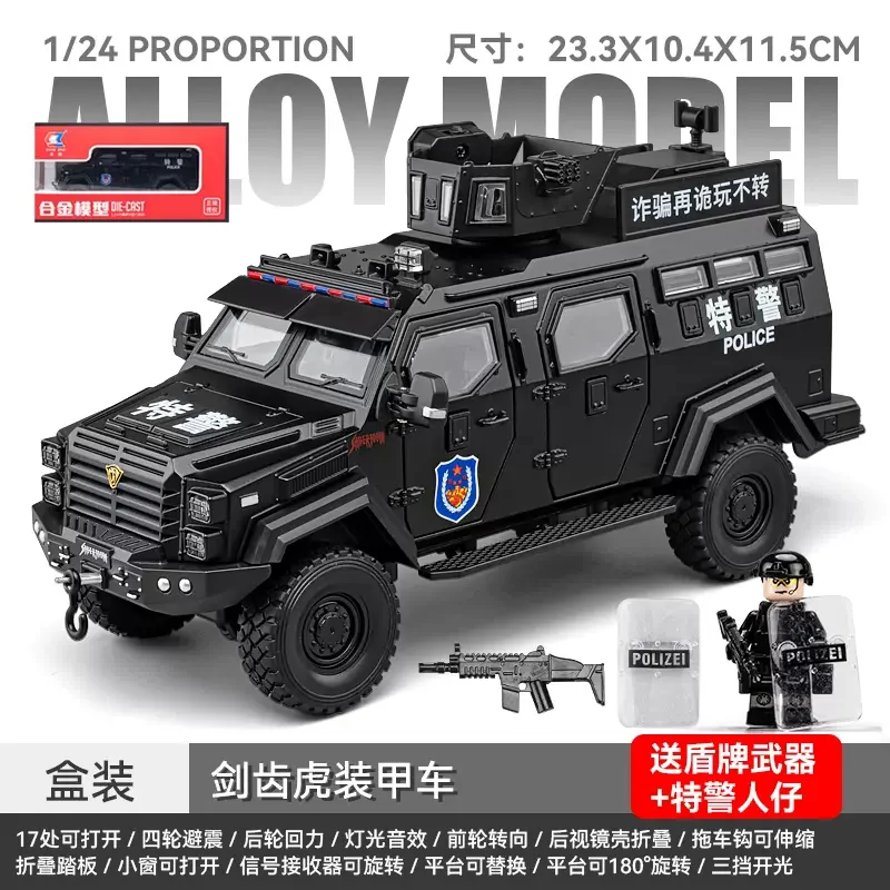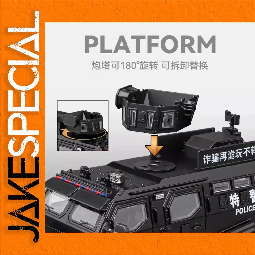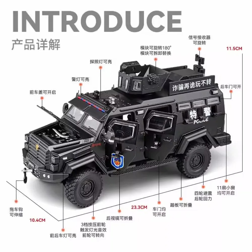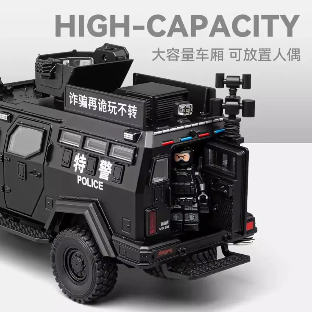 Immerse yourself in the commanding presence of this meticulously crafted 1:32 scale diecast armored riot car. Designed for enthusiasts and collectors, this model boasts a rugged, military-inspired aesthetic with a sleek matte black finish accentuated by detailed panel lines, grille textures, and angular wheel arches. The transparent windows reveal an intricately detailed interior, adding depth to its realistic appearance. The roof features a rotating platform and hatch capable of 180° rotation, complemented by mounting brackets for additional accessories. Powered by batteries, this model offers functional sound and light effects, enhancing its immersive realism. Its durable metal construction and precise detailing make it perfect for display or imaginative scenarios, truly capturing the essence of an authoritative tactical vehicle.