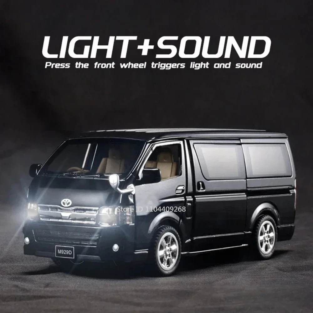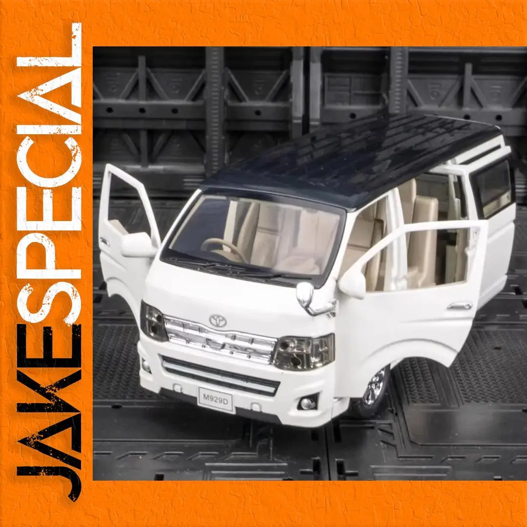 Experience owning a beautifully crafted miniature of the iconic HIACE van with this detailed 1:32 scale diecast model. Crafted with a durable alloy body, it features a sleek white finish accented by a contrasting black roof, capturing the modern vibe of the actual vehicle. The model boasts a realistic front grille with silver detailing, clear headlights with black accents, and stylish silver side mirrors. The openable side doors reveal a beige interior, adding a sense of authenticity. Measuring approximately 16 cm in length, it’s perfect for display or collection. The functional light and sound effects, along with a pull-back feature, make this model both eye-catching and interactive, ideal for enthusiasts and collectors alike.