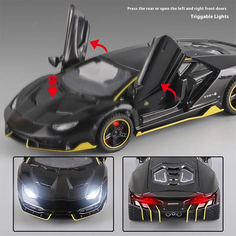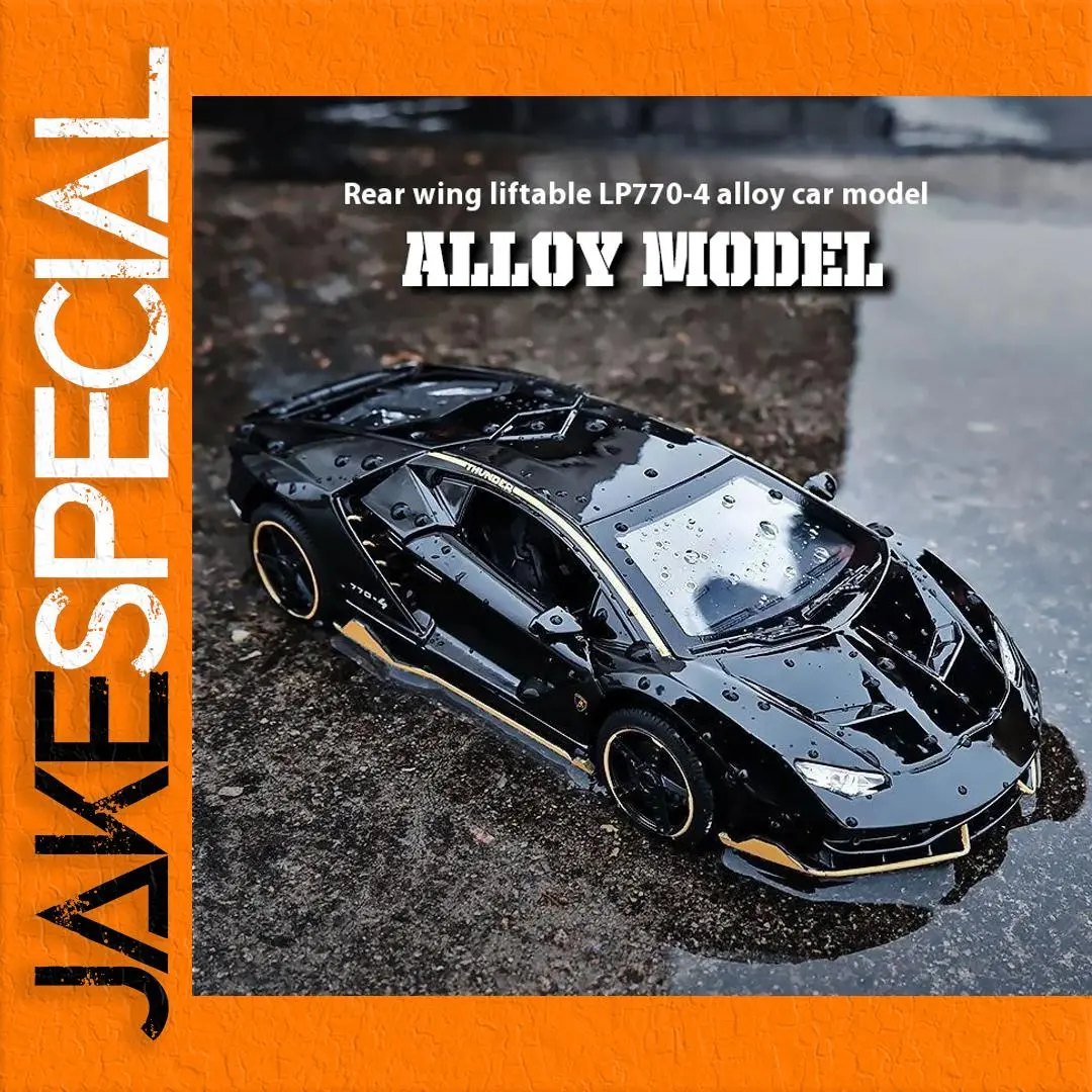 Experience the allure of automotive artistry with this exquisite 1:32 scale diecast model of the LP770-4 sports car. Dressed in a glossy black finish and adorned with bold gold accents, this model exemplifies the luxury and performance of high-end sports cars. Its aerodynamic design features pronounced air intakes and a striking grille at the front, detailed headlights that reflect an aggressive stance, and an adjustable rear wing for dynamic aesthetics. The meticulously crafted interior details visible through the windows add to the model's charm. Complemented by sophisticated sound effects and cool lighting, this model stands as a remarkable desktop ornament, ready to elevate your collection and spark conversations.