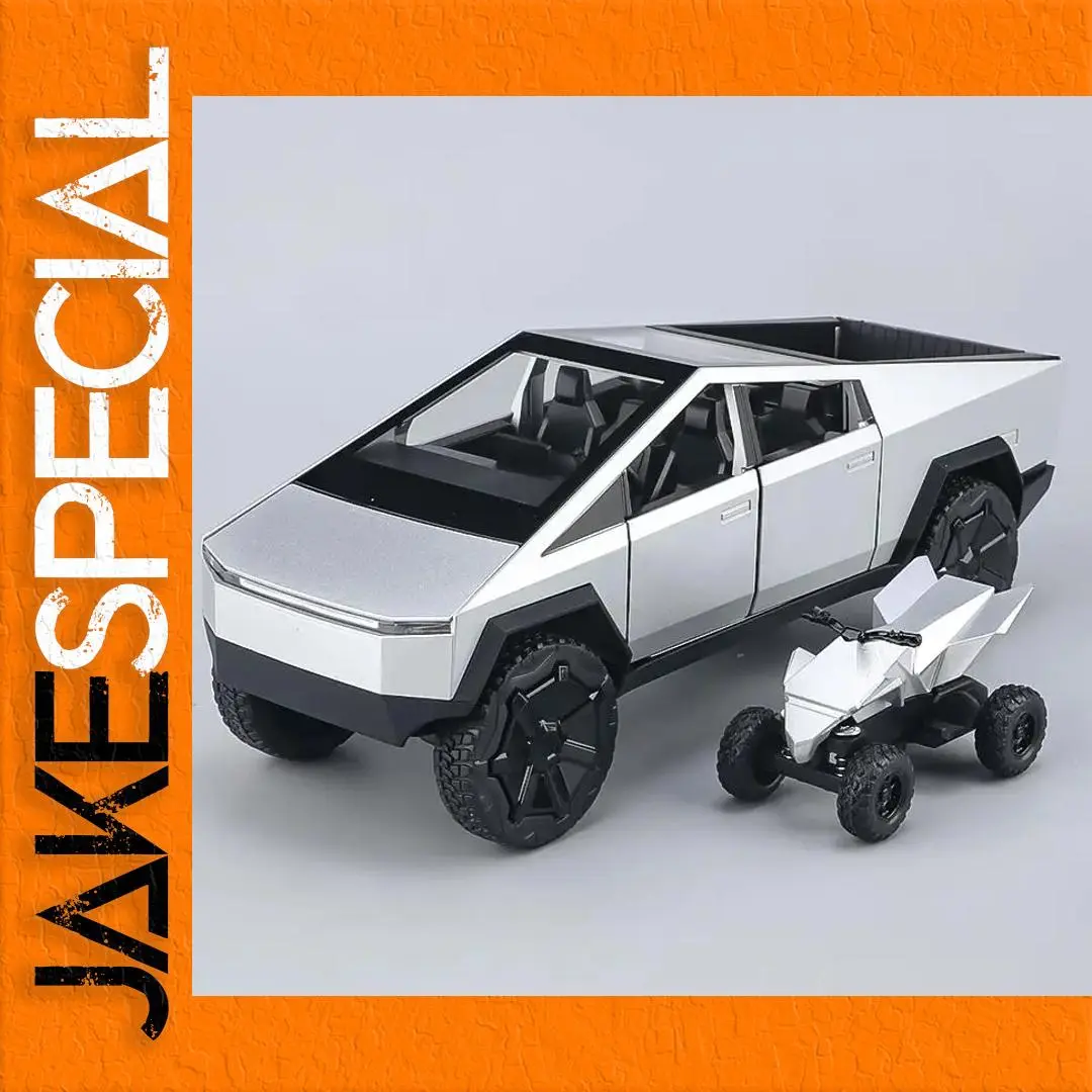 Experience the thrill of adventure with this sophisticated 1:32 scale diecast model truck and quad bike set. The sleek silver pickup truck is designed for off-road excitement, boasting a futuristic aesthetic with its angular lines and flat front end. Its robust wheels with deep treads are perfect for conquering rough terrains, while the included quad bike offers compact, agile fun. Constructed from durable metal, this collectible set is more than just a toy; it's a charming addition to any collection. The pull-back mechanism enhances playability, making it a delightful gift for any enthusiast aged 14 and up. Start picturing the joy it will bring today!