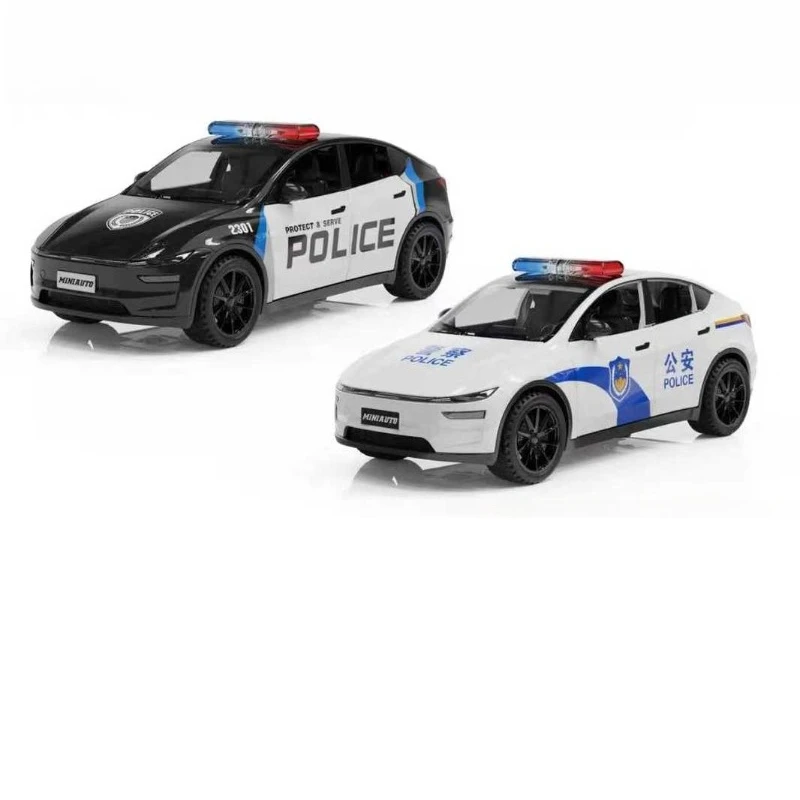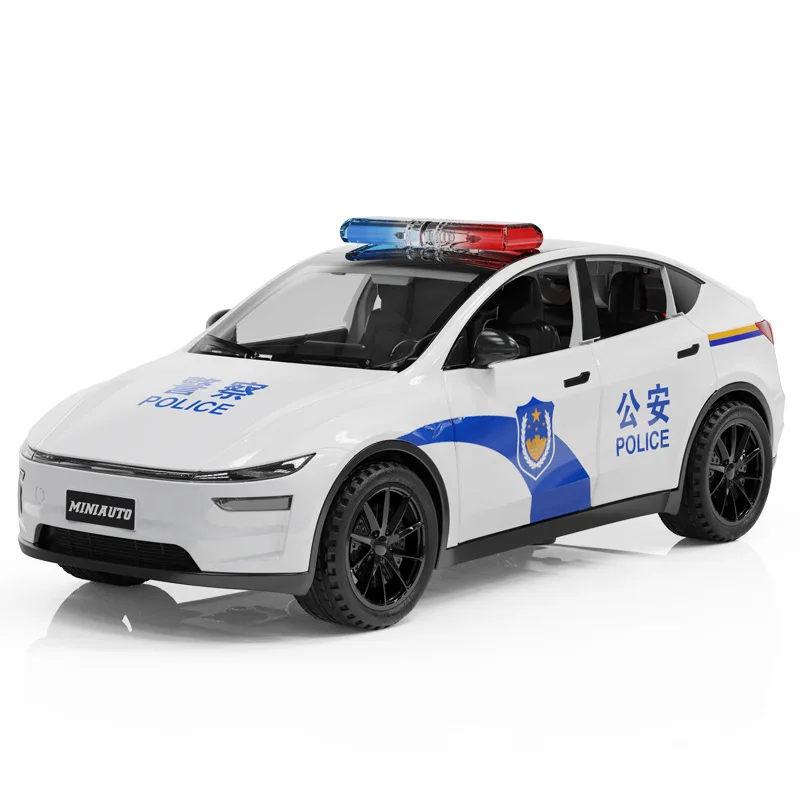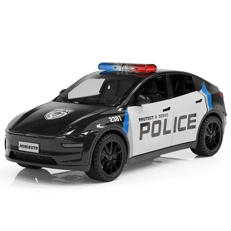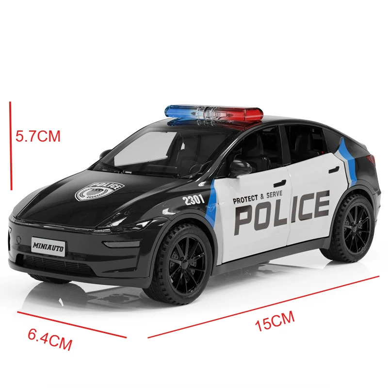 - Features miniaturized black multi-spoke wheels, side mirrors, door handles, and a roof-mounted police light bar with red and blue lights, replicating real police vehicles.