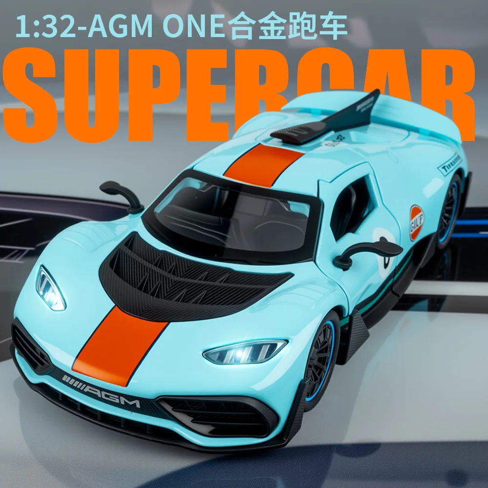 Step into the world of high-speed racing with this meticulously crafted 1:32 scale diecast model. Featuring a dynamic design, the model captures sleek, aerodynamic lines that evoke a sense of motion and performance. The vibrant light blue body is accentuated by a bold central orange racing stripe, running from the front bumper, over the hood and roof, to the rear, creating a striking visual contrast. The finish is glossy, amplifying its high-performance appeal. Detailing includes narrow, angular headlights, black accents on the grille, side mirrors, and bumper, plus a prominent black rear wing spoiler that emphasizes its racing DNA. Black multi-spoke wheels with textured racing tires enhance its realistic appearance, making it perfect for collectors and enthusiasts alike.