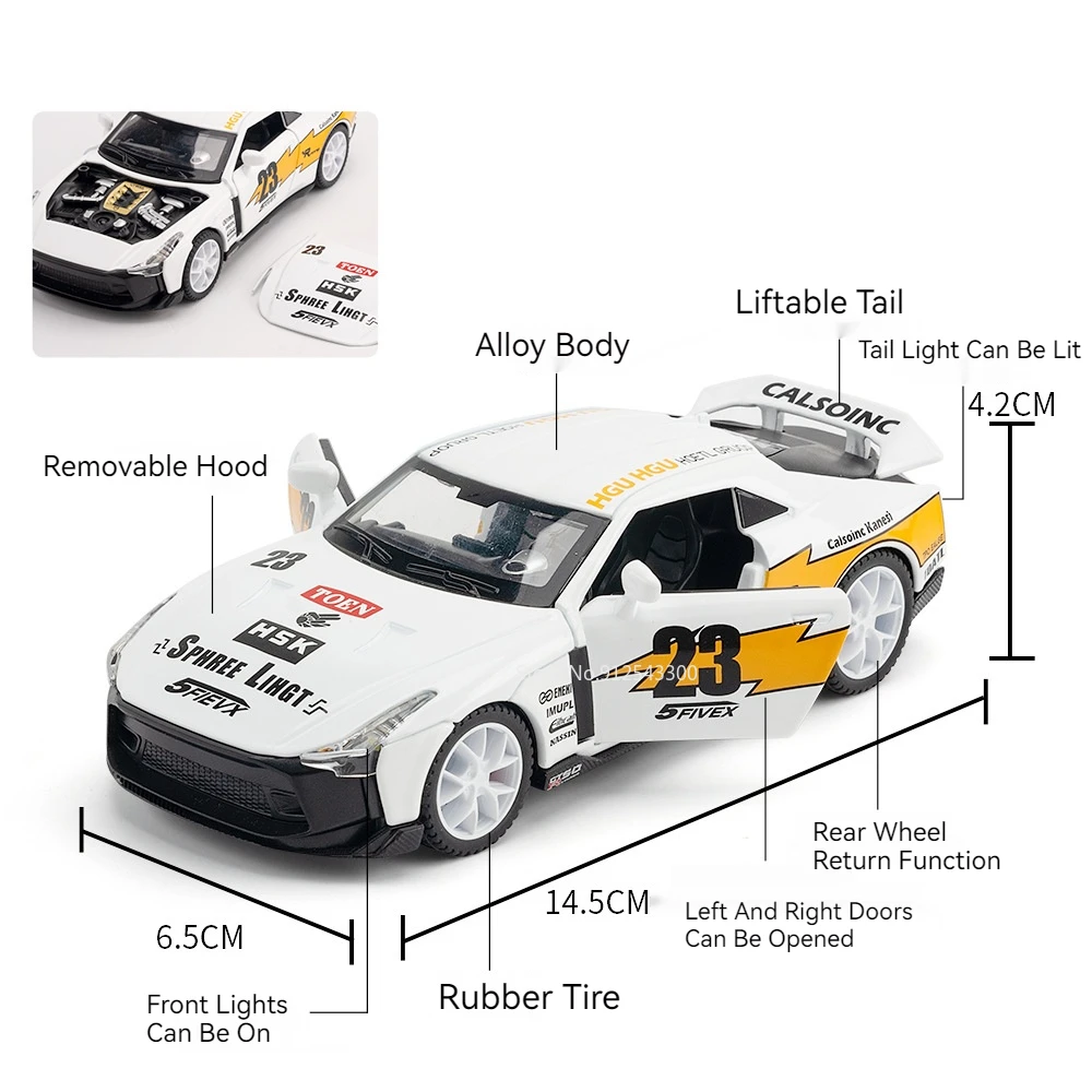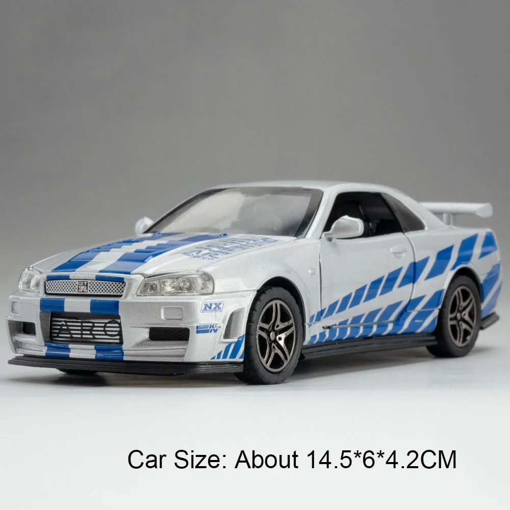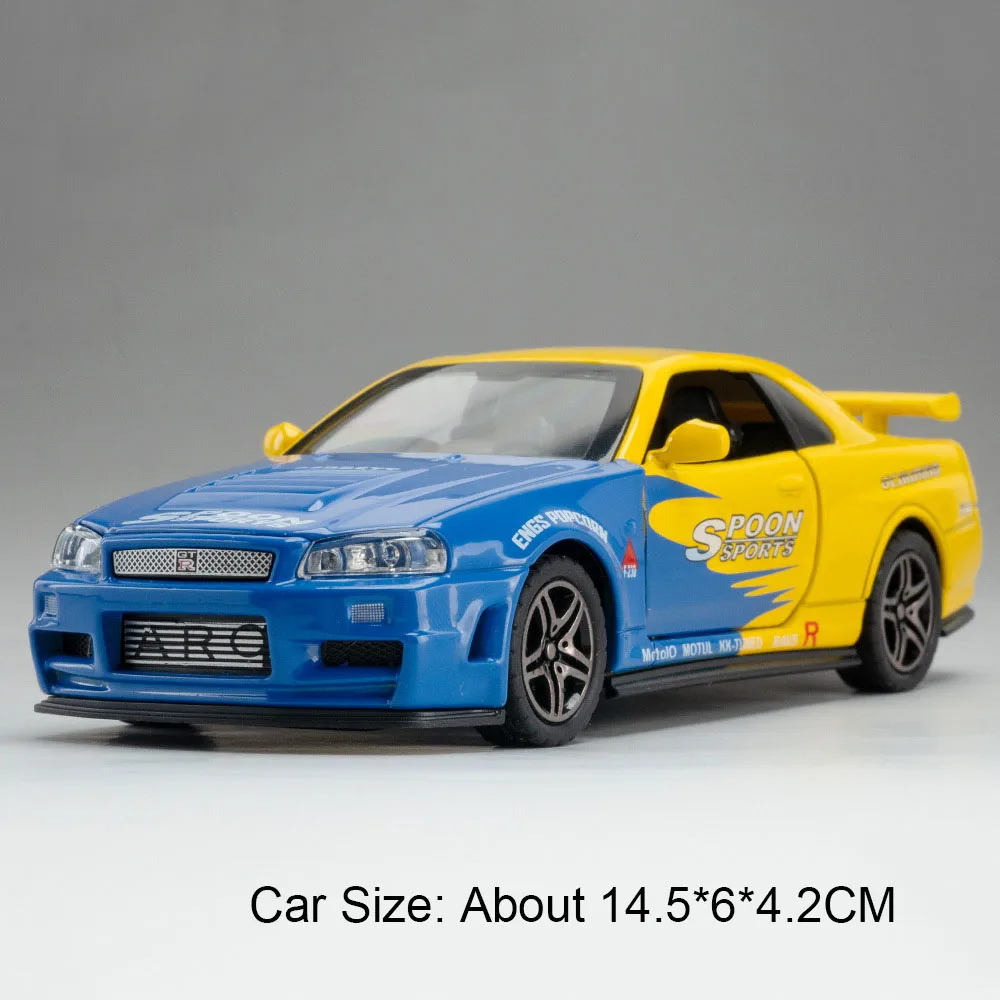- This high simulation diecast model measures approximately 14.5 x 6.5 x 4.2 cm, with the R34 version slightly narrower at 6 cm, replicating real racing dimensions accurately in a scaled size.