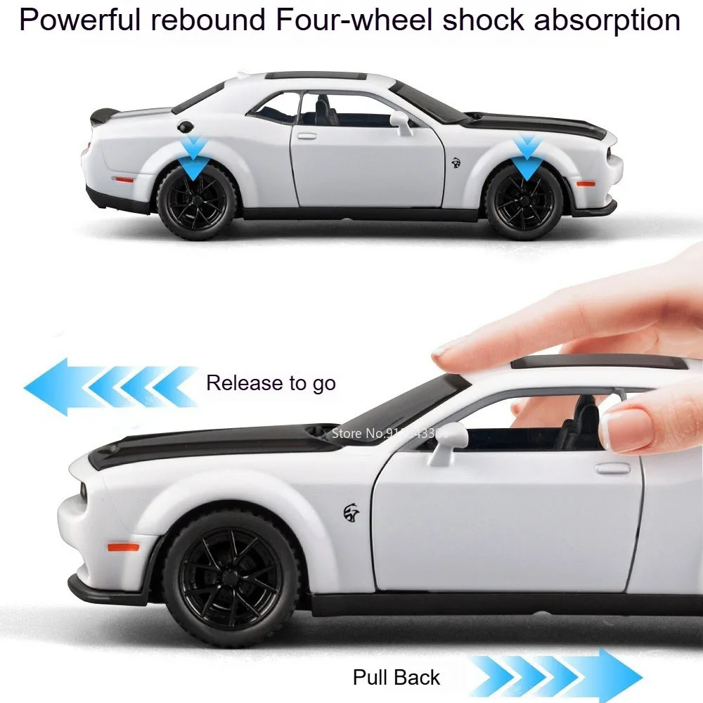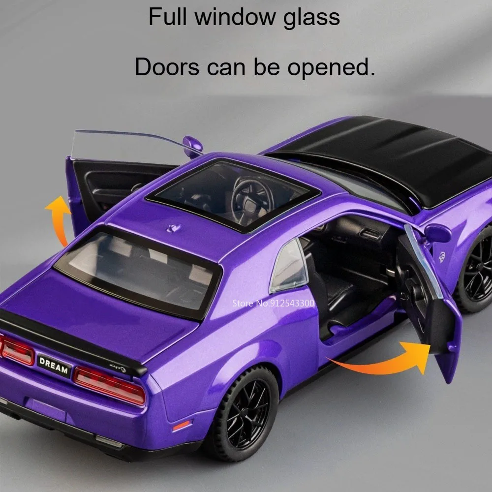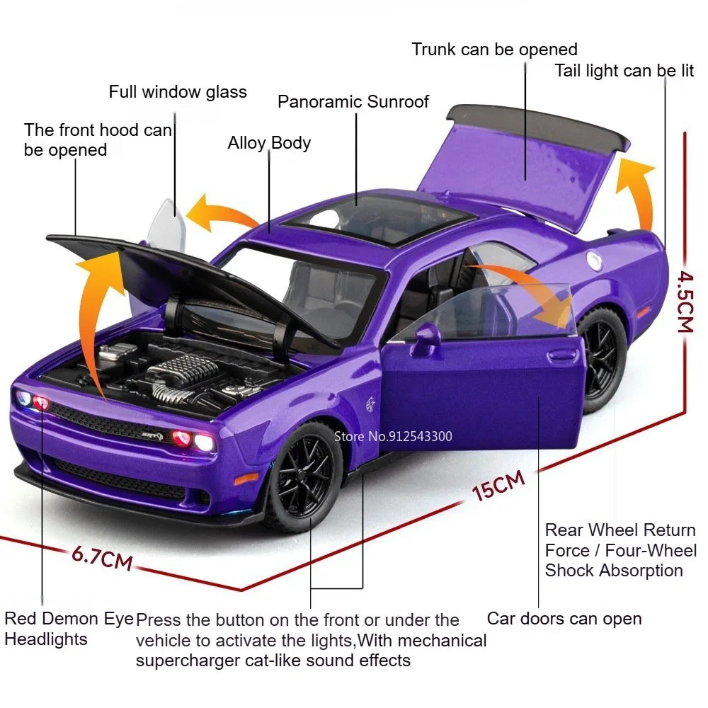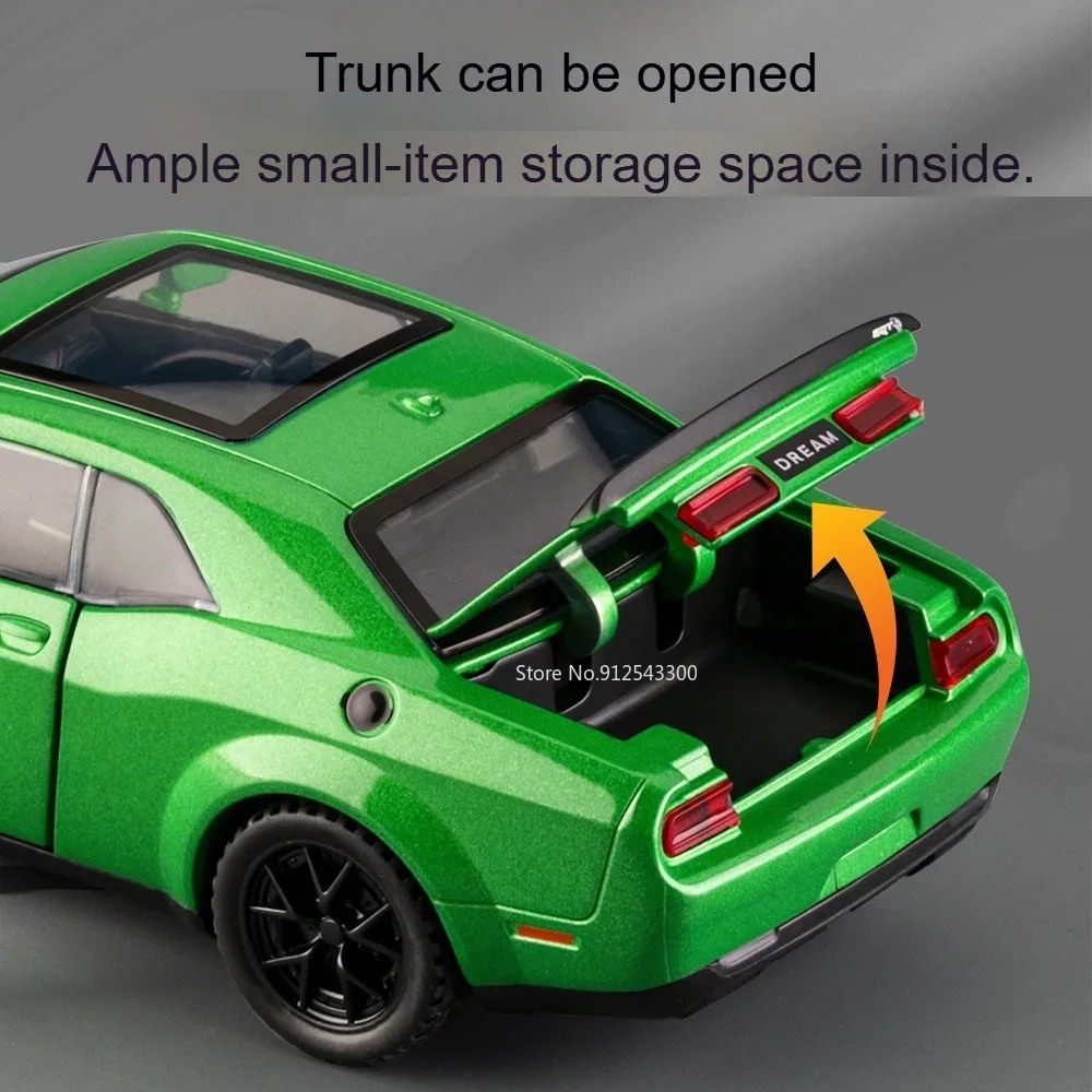 Experience the thrill of high-performance racing with this meticulously crafted 1:32 scale diecast sports car model. Made with a durable metal body, it boasts striking design elements including realistic shock absorption, detailed grille, narrow illuminated headlights, and a smooth aerodynamic shape. The vibrant colors—such as bold Hellcat Green and sleek Viper Red—highlight its aggressive and sporty aesthetic. Functional doors open for added realism, while rubber tires mounted on black alloy rims ensure authentic appearance. The model features sound and light effects to bring it to life, and a pull-back mechanism allows for fast-paced fun. Perfect for collectors or car enthusiasts, this compact, high-detail replica enhances any display or play experience.