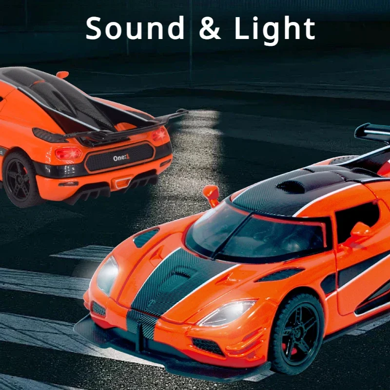 This vibrant diecast model of a sports car, designed at a 1:32 scale, showcases an impressive orange body adorned with striking black accents and racing stripes that amplify its sporty appeal. The sleek aerodynamic shape, complete with dramatic upward-swinging doors, enhances its dynamic presence. Crafted from durable metal, this model is built to last and features a glossy finish that adds sophistication. Not only does it have pull-back action for interactive play, but it also incorporates sound effects and lights, making it an exciting collectible. Ideal for enthusiasts aged 14 and above, this model exemplifies high-performance aesthetics and meticulous attention to detail.