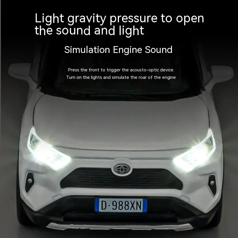 Experience the thrill of owning this highly realistic 1:32 scale diecast RAV4 model, meticulously crafted to reflect the authentic look of the full-sized vehicle. The sleek white finish offers a modern, polished appearance, accented by black grille details, wheel arches, and lower body trim that give it a rugged, off-road vibe. Functional and visually appealing, this model features opening side doors, allowing you to display the interior. The front and rear covers also open, showcasing the detailed cabin and engine components. Equipped with steerable front wheels, the model can be turned left or right, adding to its playability. Activate sound and light effects by removing a plastic plug beneath the car and opening the doors to enhance your display or play experience. Crafted from durable metal, it combines aesthetic precision with resilience, making it a cherished collectible or engaging toy for enthusiasts and young collectors alike.