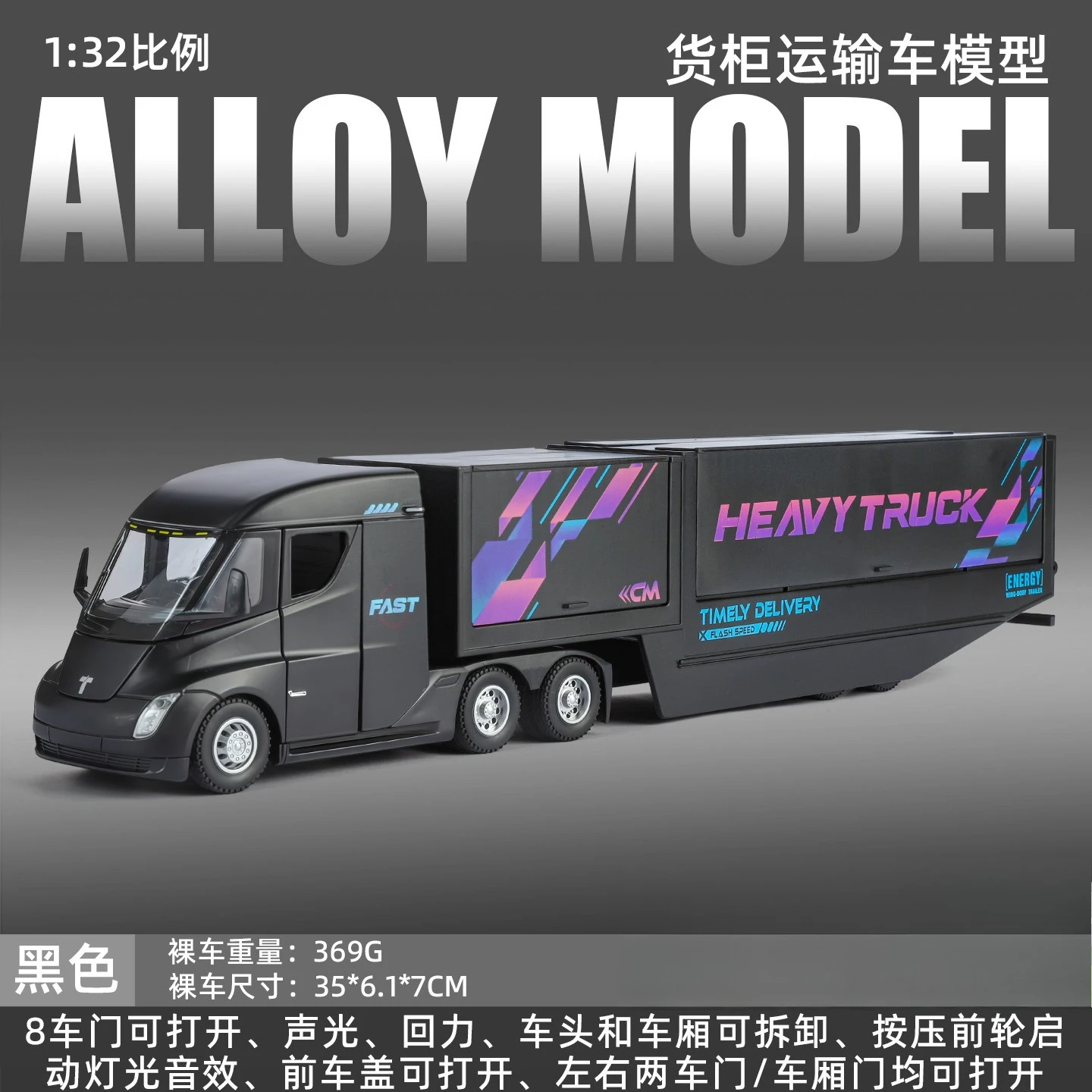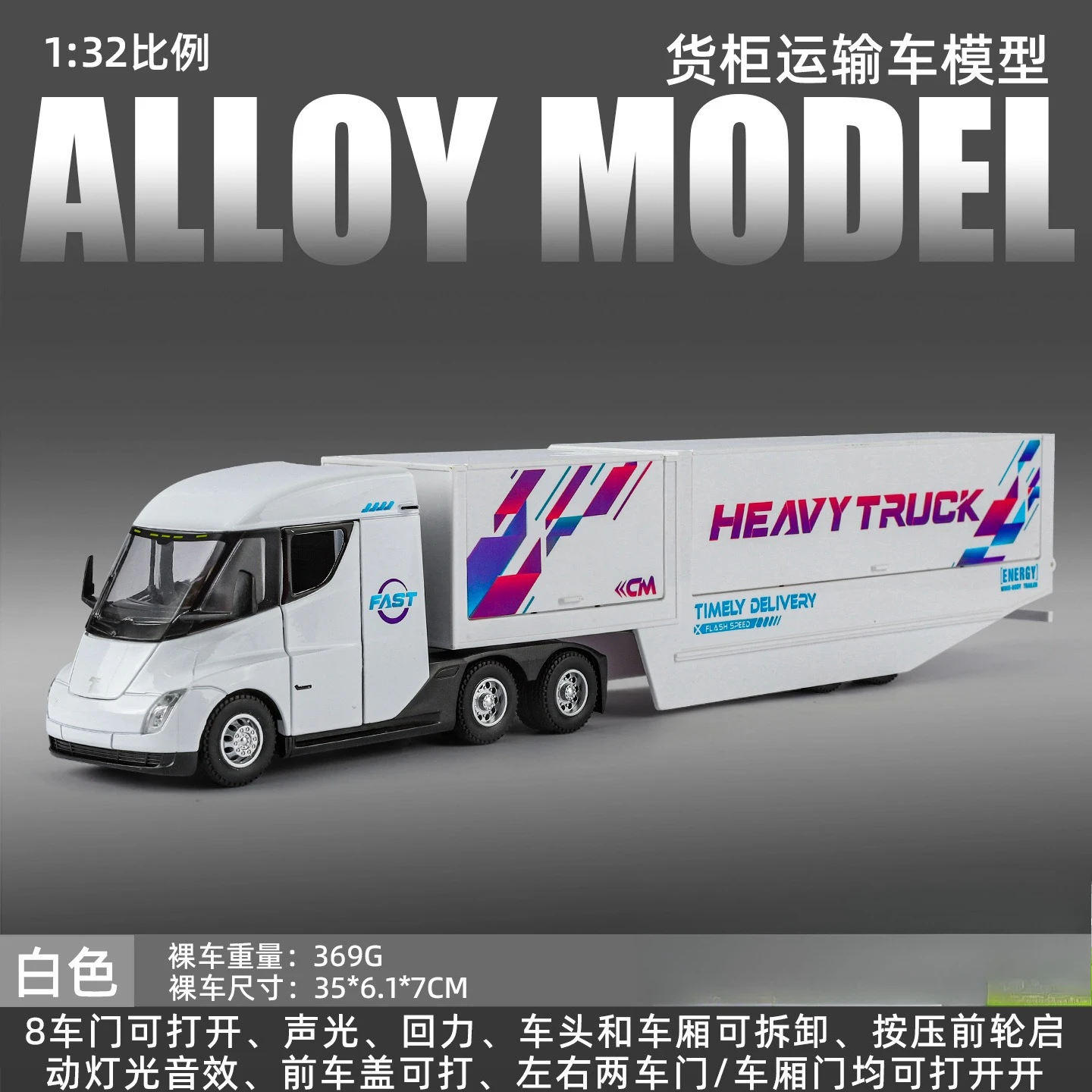 This impressive 1:32 scale simulation truck container model is designed for decorative purposes, boasting a striking white cab and a sleek, aerodynamic profile. The model features large, clear windows that reveal a minimalist yet appealing interior. Accented with bold “FAST” lettering and vibrant stylized lines in blue, pink, and purple, this truck conveys a sense of speed. The accompanying trailer maintains this aesthetic, showcasing eye-catching graphics with “HEAVY TRUCK” and “TIMELY DELIVERY” prominently displayed. Its high-quality diecast alloy construction and metallic wheels ensure durability and enhance its visual appeal, making it an excellent addition to any collection or play scenario tailored for enthusiasts aged 14 and over.