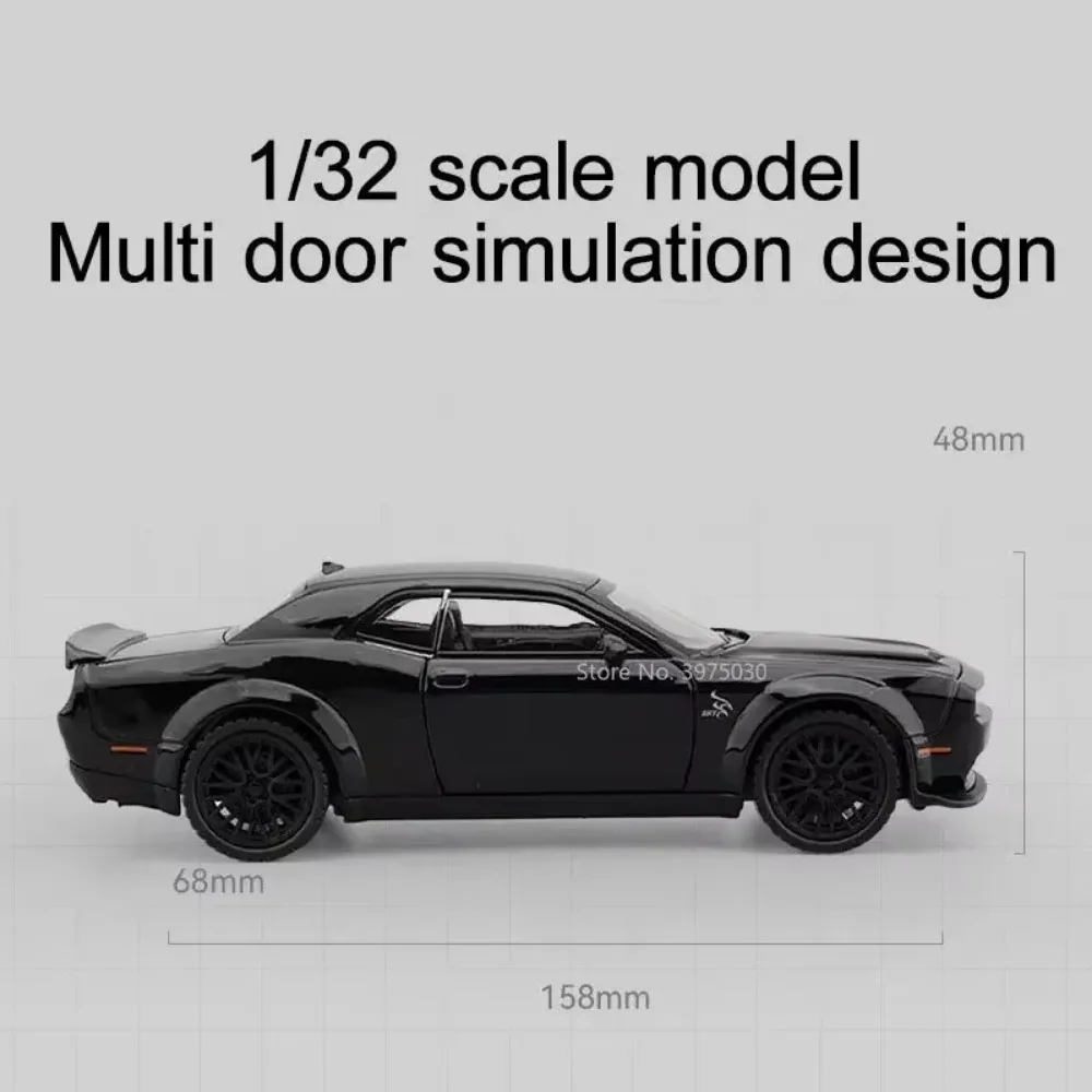 Imagine owning this stunning 1:32 scale Dodge Hellcat sports car miniature, seamlessly blending sleek design with functional features. The glossy black finish, complemented by finely crafted details like the front grille, circular red-illuminated headlights, side mirrors, and door handles, makes it a standout collectible. Its aerodynamic, low-profile silhouette exudes modern sportiness and realism. Made from durable zinc metal with a plastic chassis and rubber tires, this model offers both aesthetic appeal and longevity. The doors open smoothly, revealing a detailed interior, while sound and light effects add excitement to display or play. Pull it back to see it roll forward effortlessly, perfect for collectors or enthusiasts alike. This miniature brings your love of high-performance cars to life with authentic style and functionality.