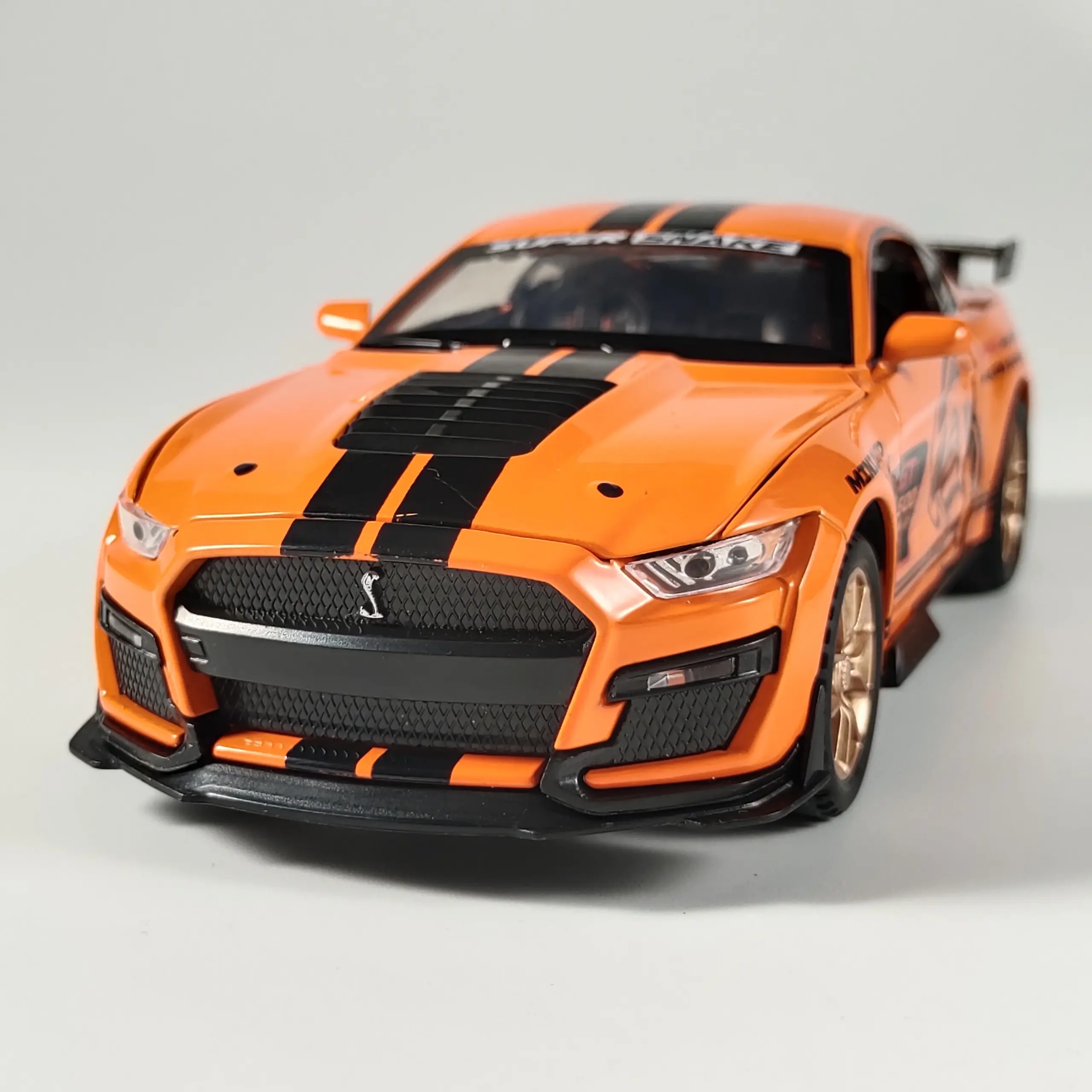 Experience the thrill of owning a stunning model of the Ford Mustang Viper GT500 in a vibrant orange finish. This diecast creation is perfect for collectors or enthusiasts who appreciate the finer details of automotive design. The sleek silhouette showcases smooth curves and aerodynamics, complemented by bold black racing stripes. The attention to detail extends to the realistic tail lights, a carbon-fiber-style spoiler, and the distinctive “SHELBY GT500” badge, making this model a remarkable addition to your collection. It's not just an ornament; it's a conversation starter, drawing admiration from all who see it.
