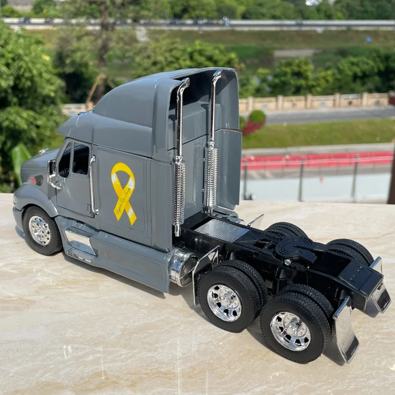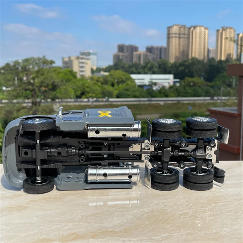 Capture the essence of a modern heavy trailer truck with this highly detailed 1:32 scale diecast model. Measuring 25.5 cm in length, 8.5 cm in width, and 13 cm in height, it features a sleek matte gray alloy and plastic construction that mimics real metal with stunning realism. The design showcases a high cab with an aerodynamic silhouette, textured chrome-like front grille, clear lens headlights, and reflective side mirrors supported by chrome arms. Smaller details like molded steps, side vents, and a vibrant yellow ribbon add to its authenticity. Perfect for collectors or enthusiasts aged 14 and up, this non-electric model adheres to safety standards and makes a striking display piece or gift.