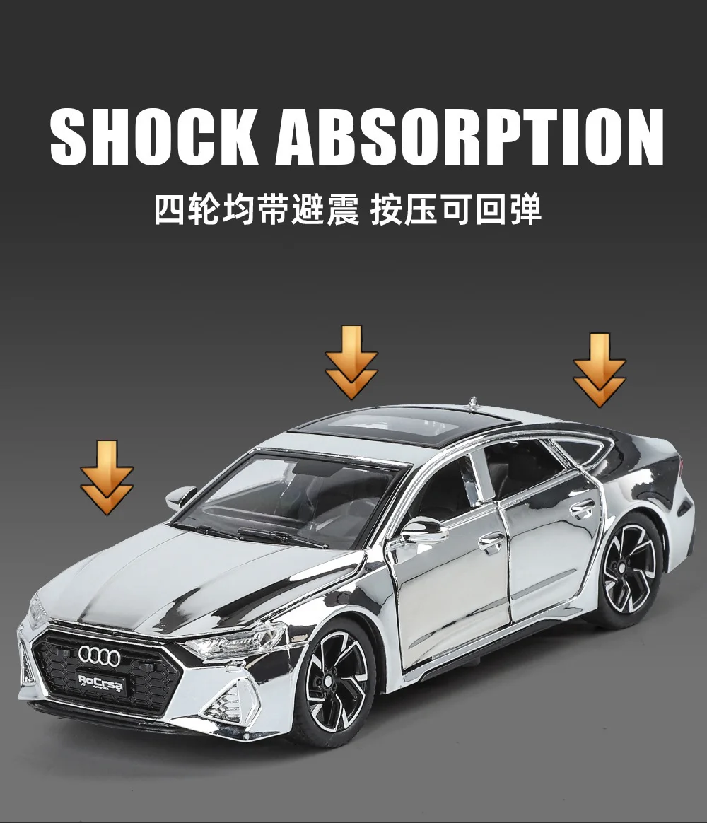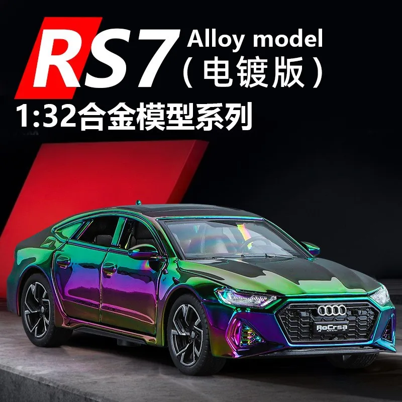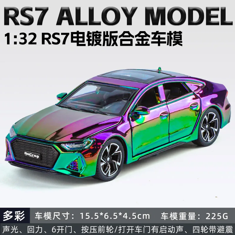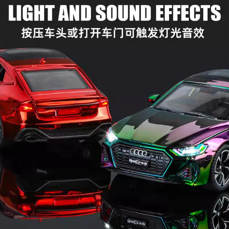 Experience the sleek elegance of this 1:32 scale diecast alloy sports car model, featuring a high-gloss, iridescent finish that shifts between rainbow shades of purple, green, blue, and pink, creating a striking holographic effect. With a modern aerodynamic design, sharp angular headlights, wide honeycomb grille, multi-spoke alloy rims, and rubber-like tires, it perfects realistic detail and sporty style. This non-electric pull-back control model is suitable for ages 15 to 35, unisex, and available in multiple color options including Gold boxed, green, purple, red, and Silver, all housed in a display box. A premium collectible for car enthusiasts seeking vibrant, eye-catching design.