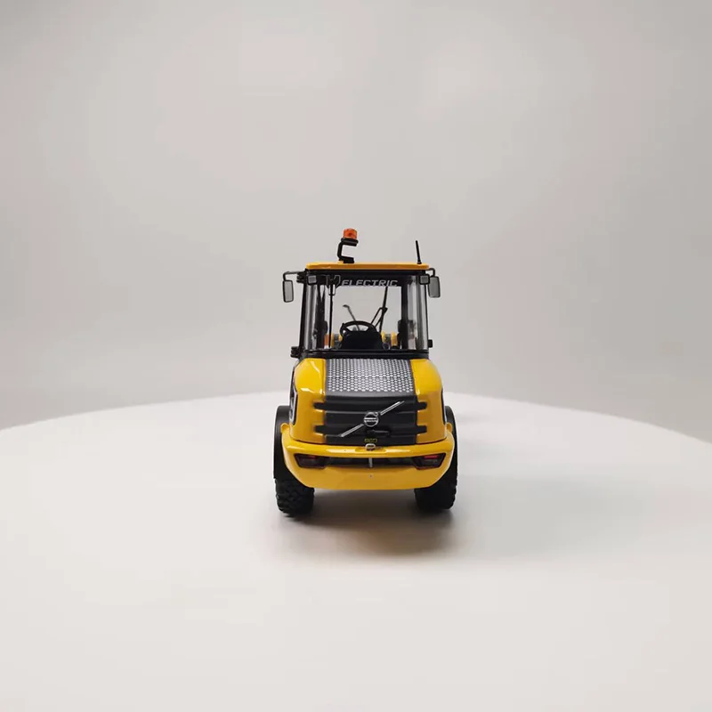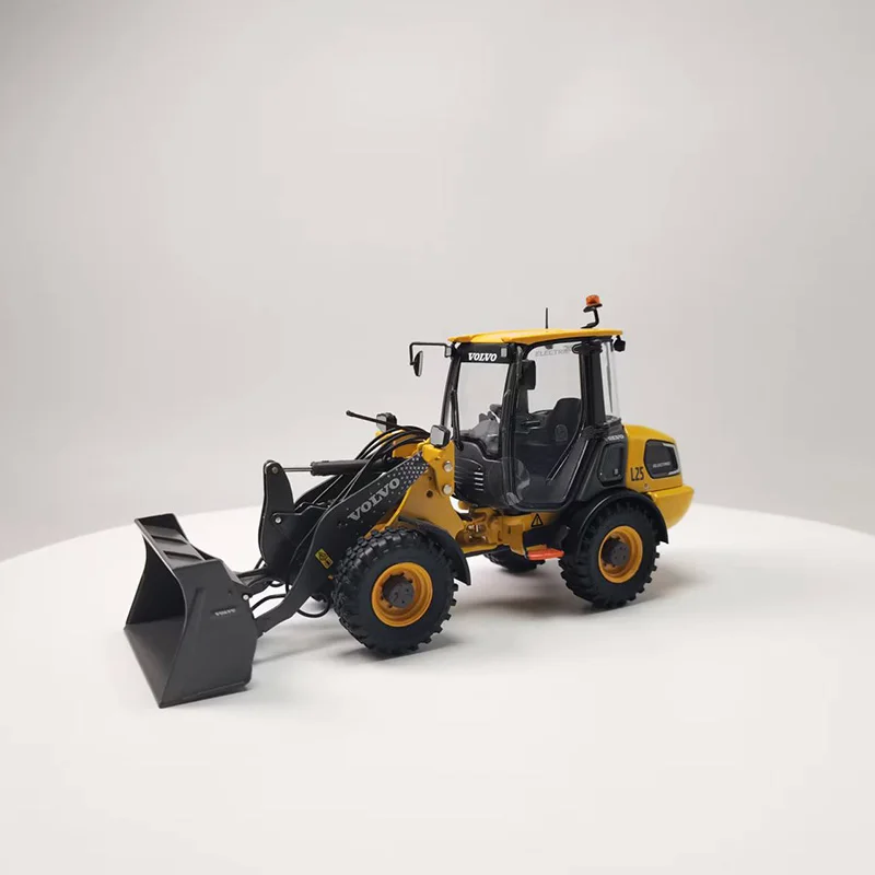 This 1:32 scale diecast alloy model of the L25 skid-steer loader features a durable alloy body, complemented by rubber tires and plastic components. The construction-yellow finish is accented with black and gray details, including a detailed enclosed cab with transparent windows, a black hydraulic arm with hoses, and a gray front bucket with a textured cutting edge. Large rugged black rubber tires with deep treads and yellow-painted rims provide a realistic and sturdy appearance. Designed primarily for display, gifting, and collection, this static model showcases precise craftsmanship, with minor paint imperfections adding to its handcrafted appeal. An ideal collectible for construction vehicle enthusiasts.