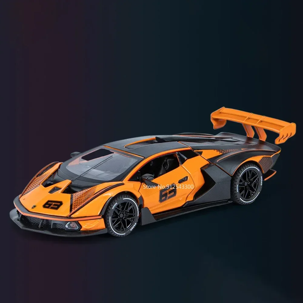 Experience the thrill of owning a meticulously crafted, high-precision diecast Lamborghini model that captures the sleek, aerodynamic design of the real vehicle. The model features a glossy, durable metal alloy body with detailed vents, sculpted lines, and a low-profile nose that exude speed and sophistication. Open the gullwing doors to reveal a realistically detailed interior, including a steering wheel and cockpit components. The rear showcases a prominent wing and diffuser, adding a competitive racecar vibe. The black rubber tires with orange-accented multi-spoke rims enhance its sporty aesthetic. Whether displayed or played with, this model elevates any collection, offering a blend of realism, style, and interactive features that bring your love for racing to life.