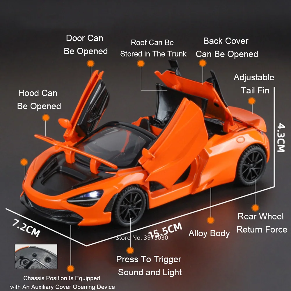 - Measuring approximately 15.5 x 7.2 x 4.3 cm for the 720S version, with precise detailing such as multi-spoke rims and sculpted side mirrors for added realism.
