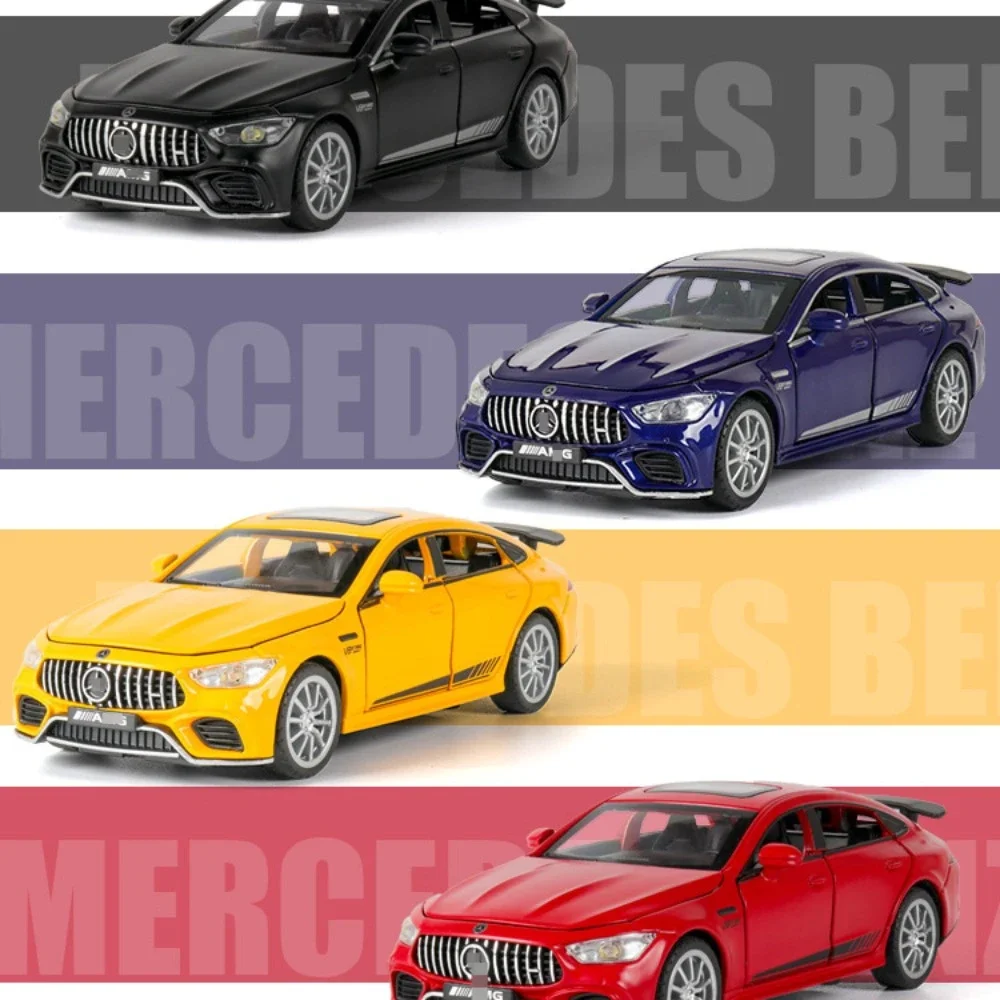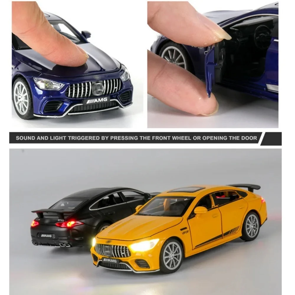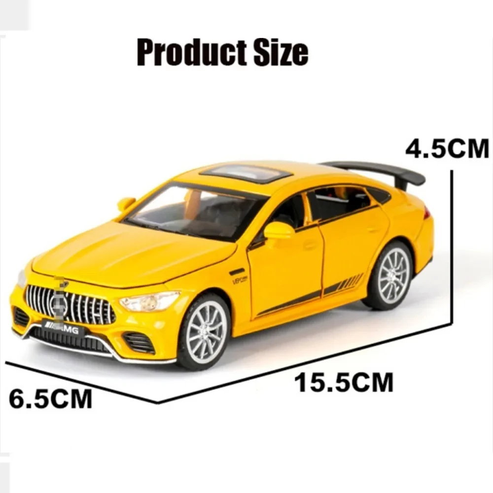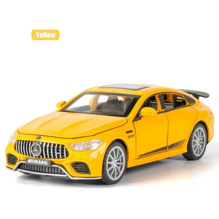 Imagine the excitement as you unveil this stunning 1:32 scale model of the Mercedes-Benz AMG GT63, presented in a vibrant bright yellow color. This diecast model captures the essence of luxury sports cars with its sleek, aerodynamic design and glossy finish. The intricate details, such as the prominent grille, realistic headlights, and beautifully crafted alloy wheels, enhance its authenticity, making it the perfect addition for both collectors and enthusiasts. The model features functional elements, including opening doors, pull-back action, and engaging sound and light effects, creating a dynamic experience. Delight in owning this piece of automotive artistry that stands out proudly on your display shelf or offers endless play possibilities.
