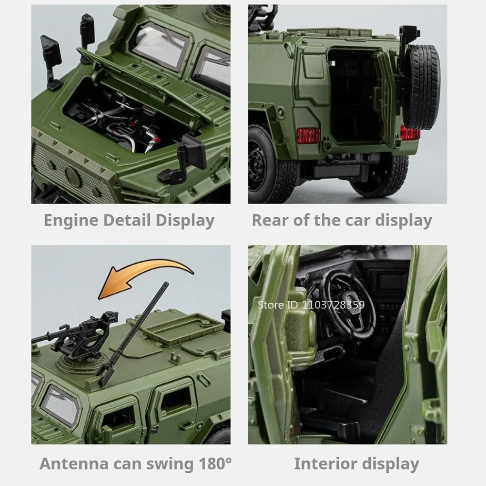 Imagine owning a highly detailed replica that boosts your collection or sparks your imagination. This 1:32 scale model features a rugged off-road military vehicle with an authentic high-simulation design. Crafted with a durable alloy metal body, it’s resistant to impact and wear, ensuring long-term enjoyment. The model showcases intricate details such as textured panel lines, rivets, decals, and markings, providing a hyper-realistic appearance. It offers interactive features including opening doors, engine hood, and trunk, along with working sound and light effects activated by pressing certain parts. Its sturdy rubber tires and physical pull-back function make it engaging to handle. This meticulously designed vehicle invites adventure and collection, giving you a powerful piece that looks striking on display or during creative play.