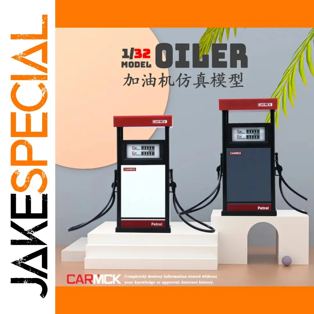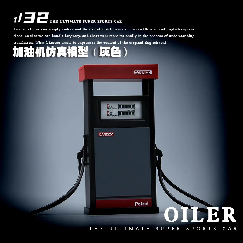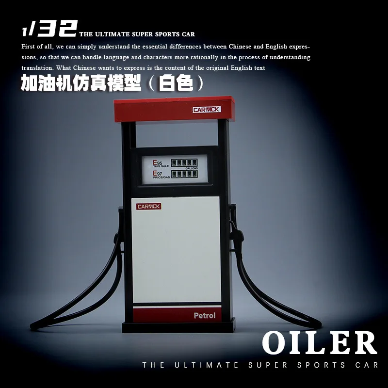 Step into a miniature world with this detailed 1:32 scale fuel station scene, perfect for toy car enthusiasts and collectors. Crafted from durable ABS plastic, this model features two black fuel dispensers with vibrant red accents, mounted on white platforms with one slightly elevated on a rectangular block. The pumps include realistic control panels with small meters and “Petrol” printed in bold red, complemented by flexible black hoses with nozzles for an authentic look. Additionally, the scene includes a wheel rack without wheels and a repair tool table, providing a comprehensive toy environment. Whether for display or imaginative play, this setup combines realism with stylized simplicity, making it a perfect addition to your collection.