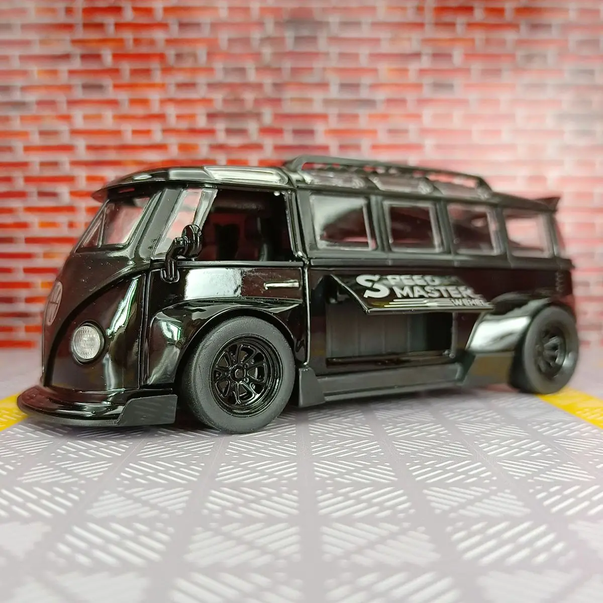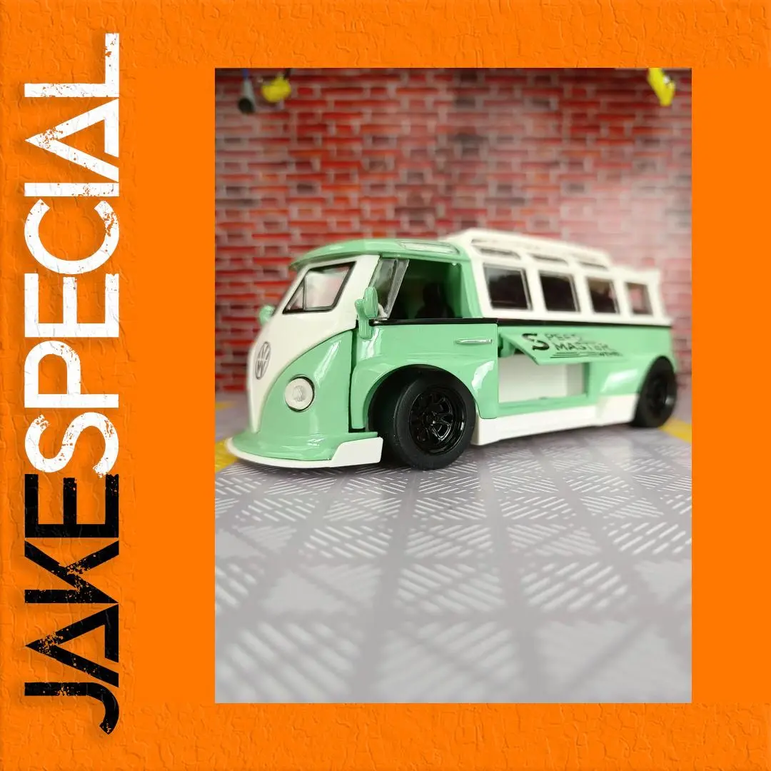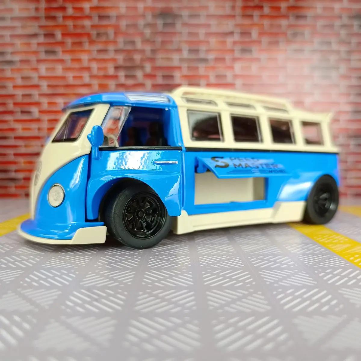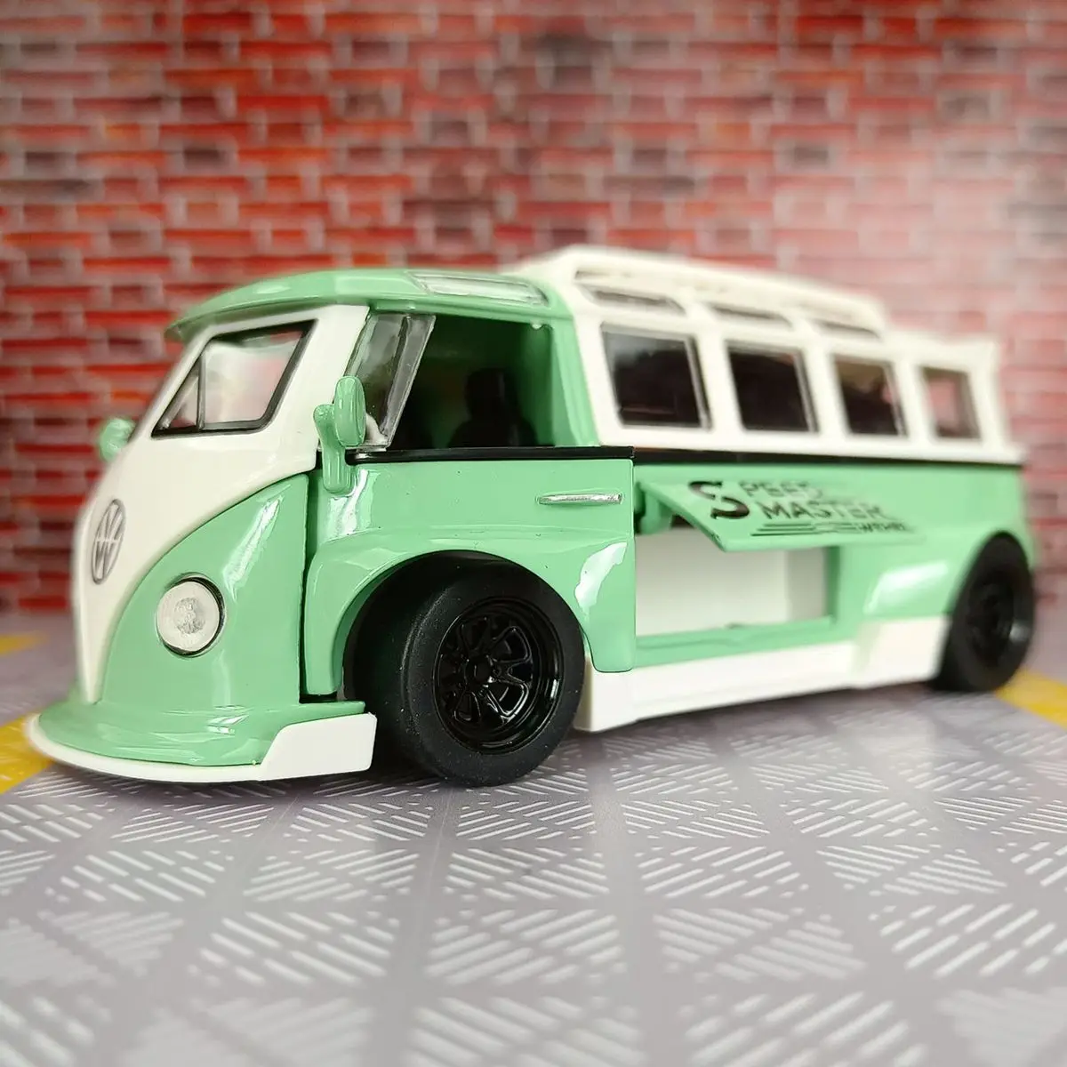 This 1:32 scale modified alloy diecast VW bus model boasts a mint green body with white accents, perfectly capturing the essence of classic design. The iconic Volkswagen logo is displayed prominently on the grill, while clear plastic windows reveal a detailed black interior. An open sliding door enhances authenticity and interactivity. The bus features a white roof adorned with windows, and distinct black rubber tires mounted on intricate black rims add a sporty touch. Crafted from durable metal, this model is perfect for collectors and enthusiasts alike, making it a stunning addition to any display or a delightful interactive piece.