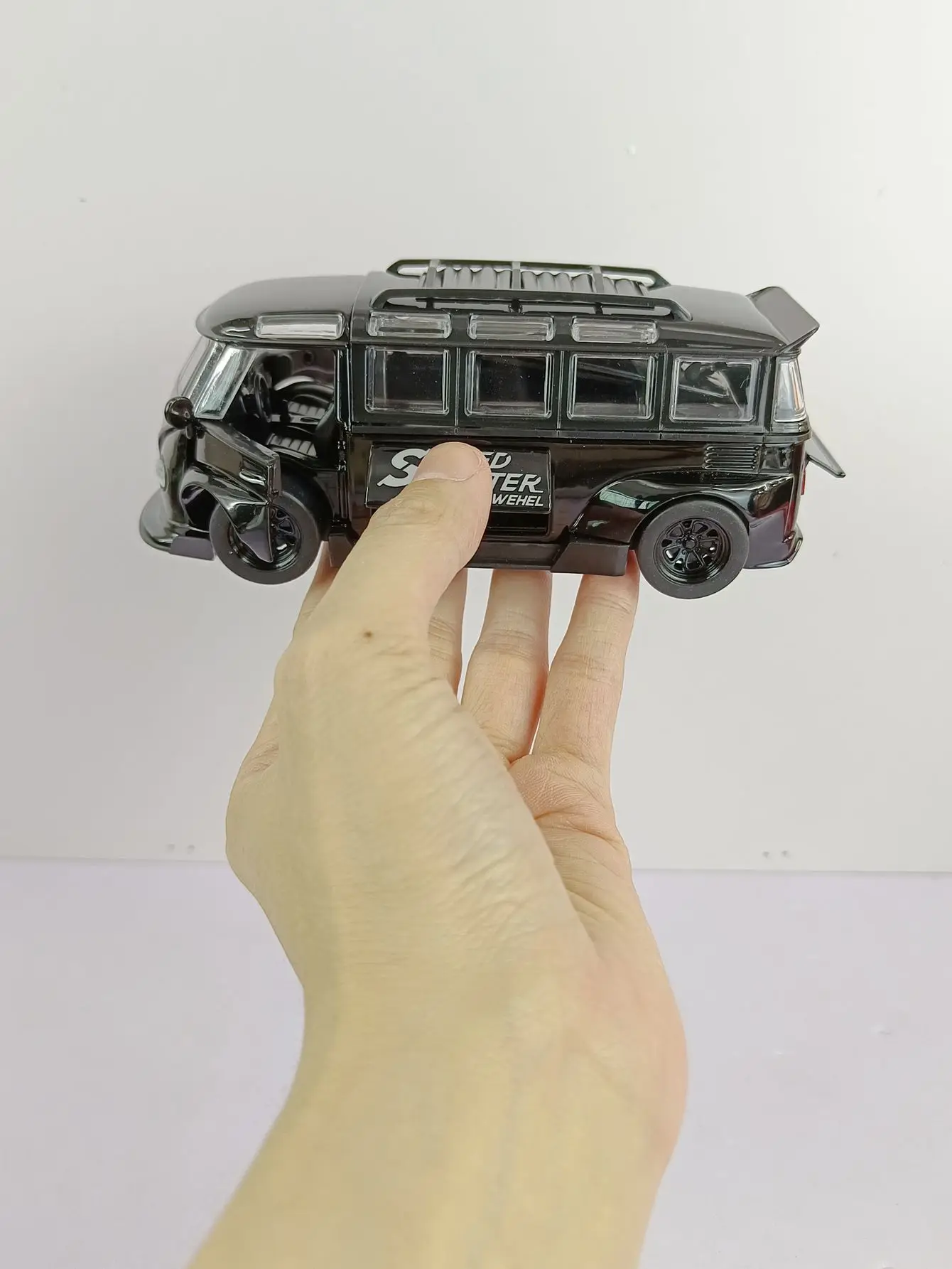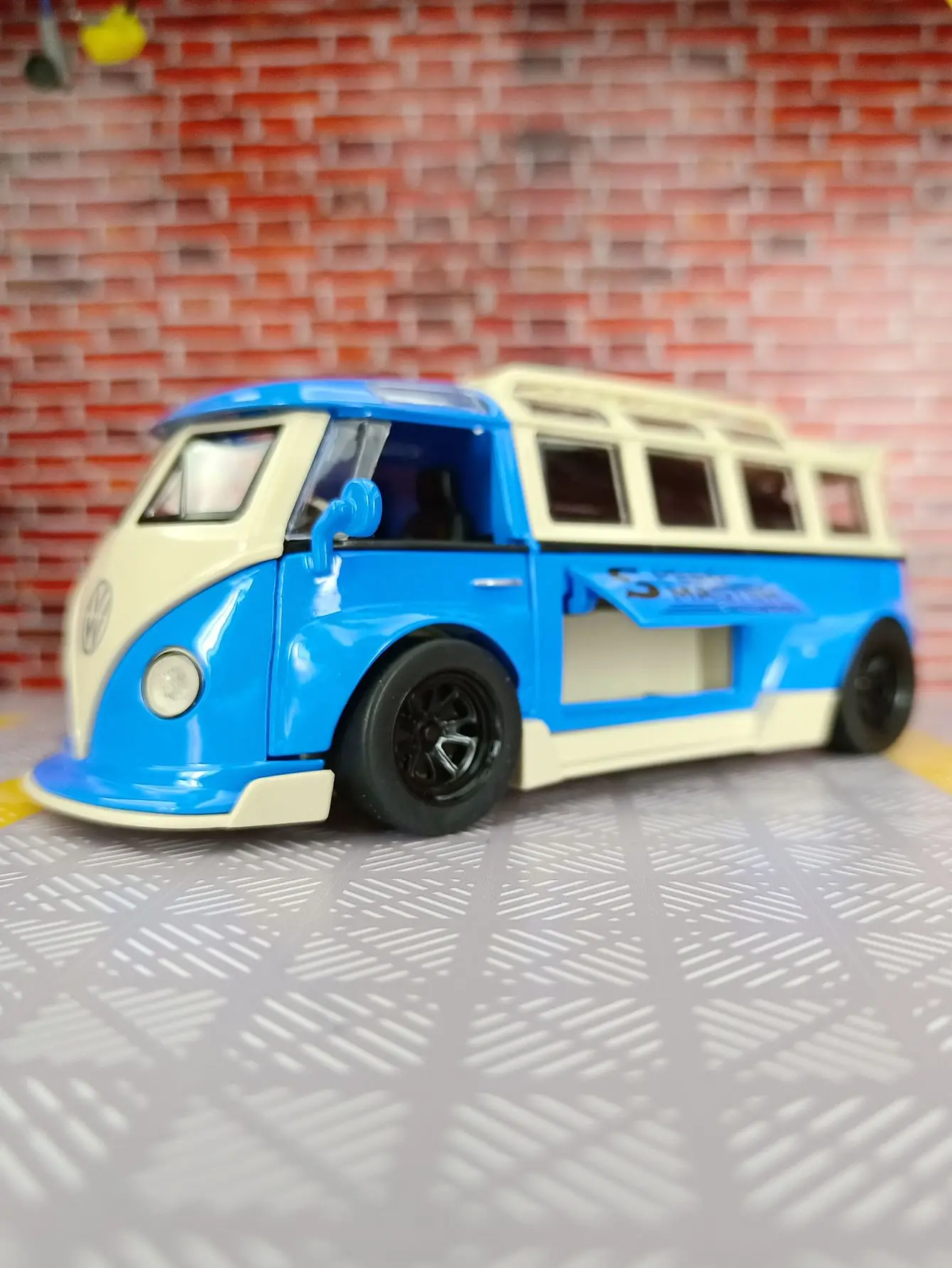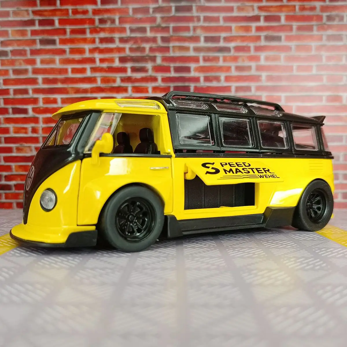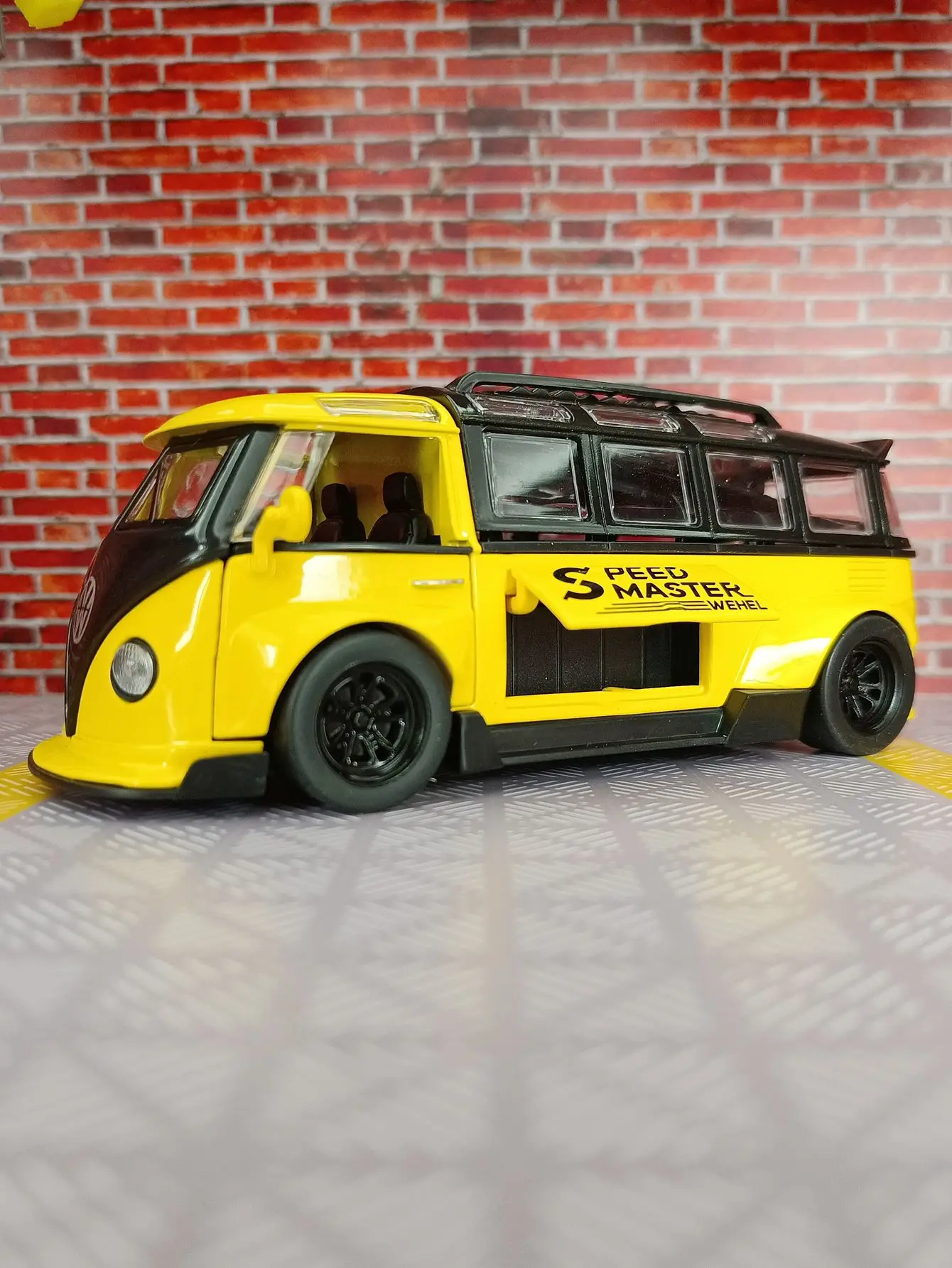 This 1:32 scale modified alloy diecast VW bus model boasts a mint green body with white accents, perfectly capturing the essence of classic design. The iconic Volkswagen logo is displayed prominently on the grill, while clear plastic windows reveal a detailed black interior. An open sliding door enhances authenticity and interactivity. The bus features a white roof adorned with windows, and distinct black rubber tires mounted on intricate black rims add a sporty touch. Crafted from durable metal, this model is perfect for collectors and enthusiasts alike, making it a stunning addition to any display or a delightful interactive piece.
