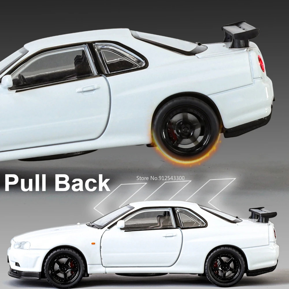 Imagine adding a sleek, high-performance racing icon to your collection. The this 1:32 Scale Skyline GTR R34 sports car boasts a glossy, aerodynamic silhouette finished in vibrant colors like silver, blue, white, or chameleon effect. Its finely detailed metal alloy body and realistic rubber tires, paired with a plastic chassis, offer exceptional durability and authenticity. The model features eye-catching racing stripes and decals, a prominent rear spoiler, illuminated headlights, and an interior with transparent windows showcasing interior craftsmanship. Its compact size of approximately 14.3 cm, with functional lights, sound, pull-back motion, and opening doors, makes it a perfect highlight for display, gifting, or adding to your vehicle collection. Experience the thrill of owning a replica of a legend.