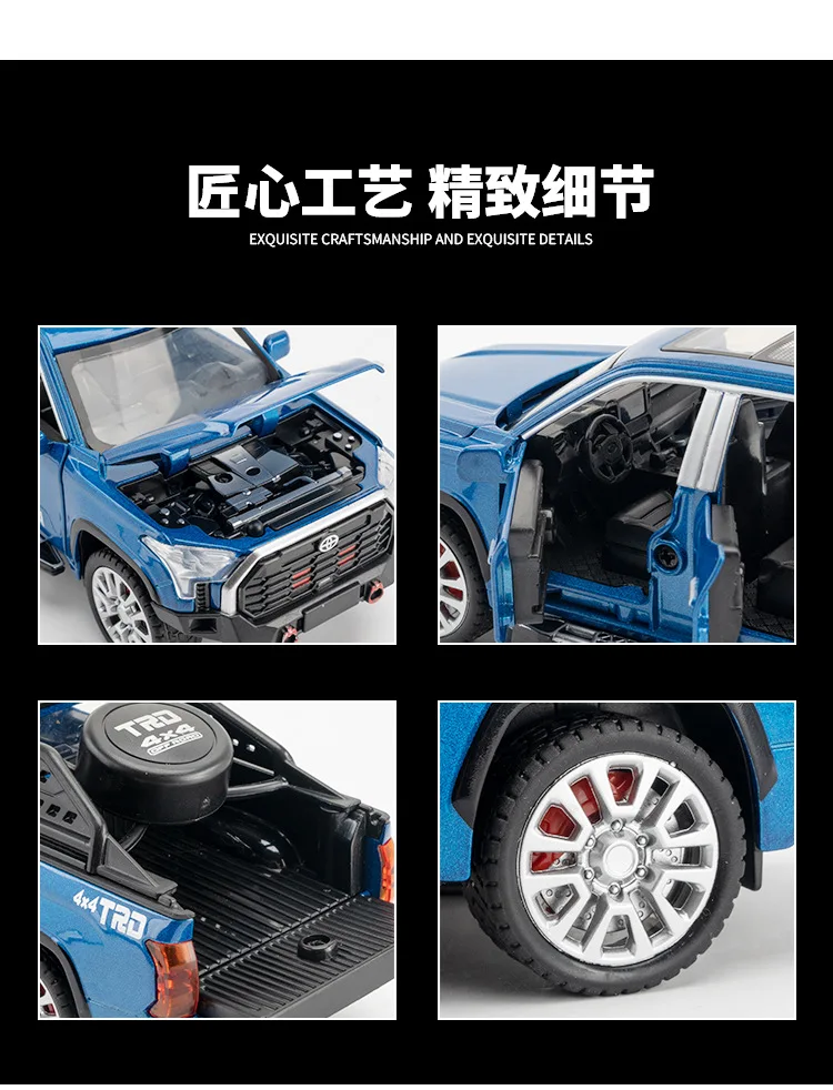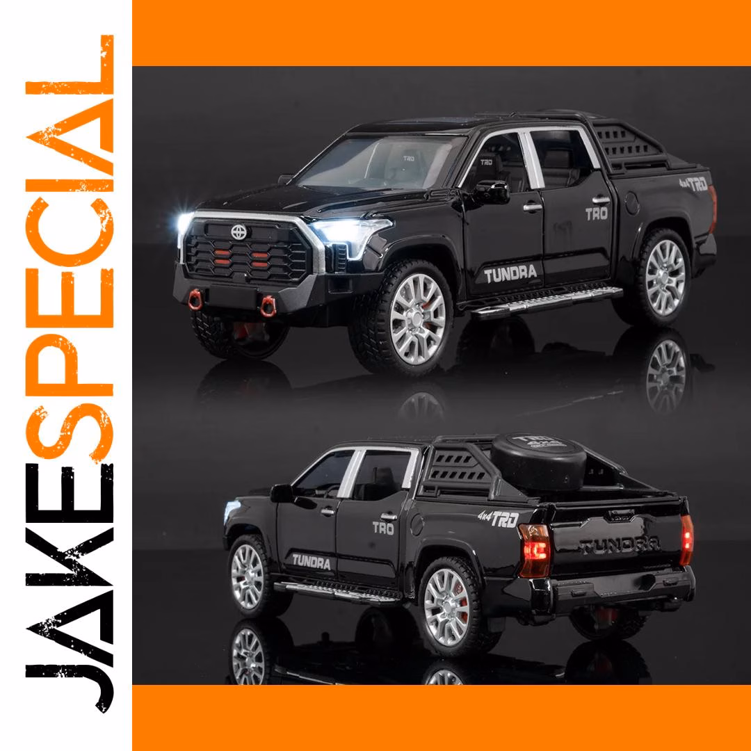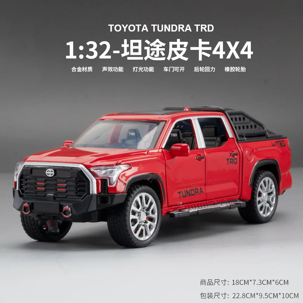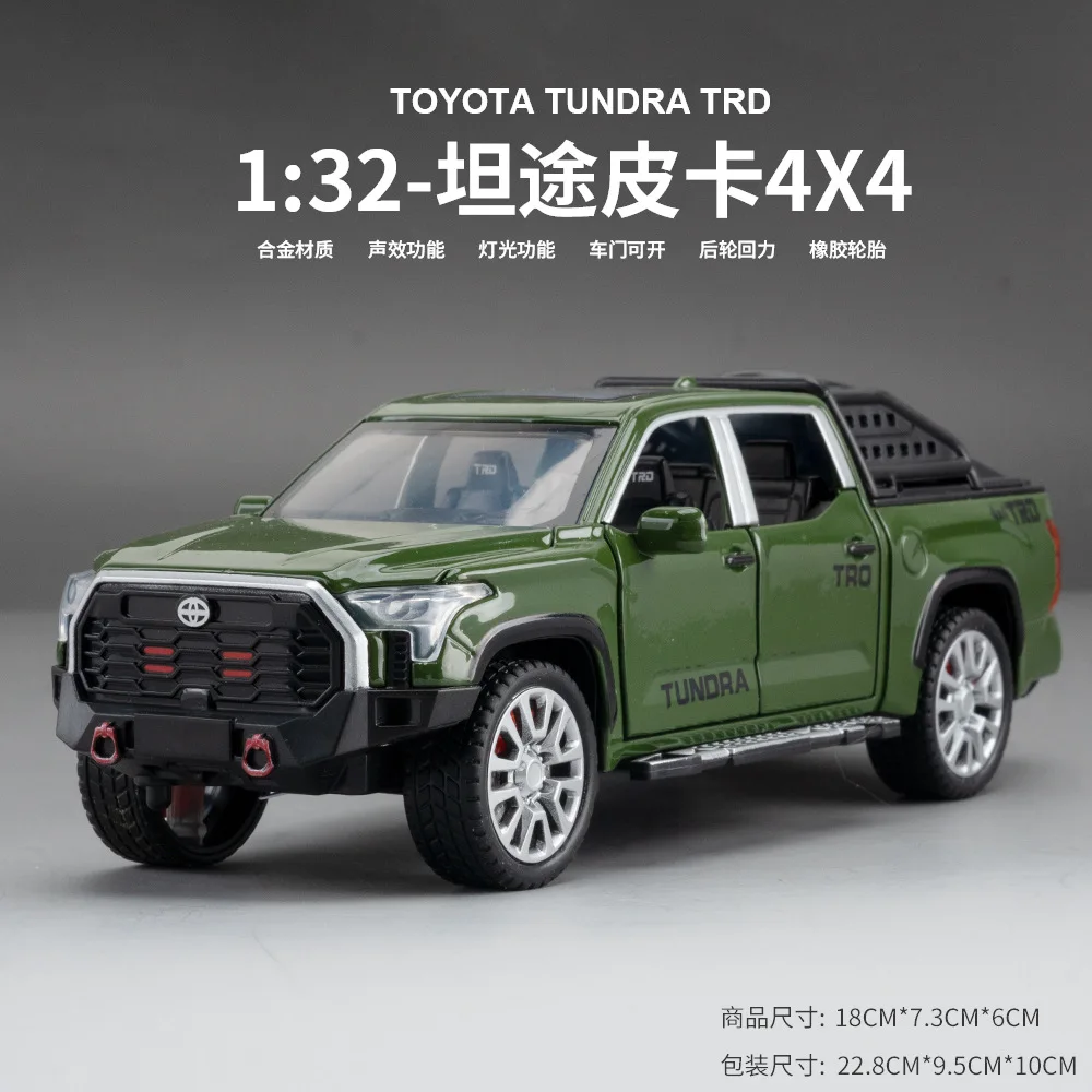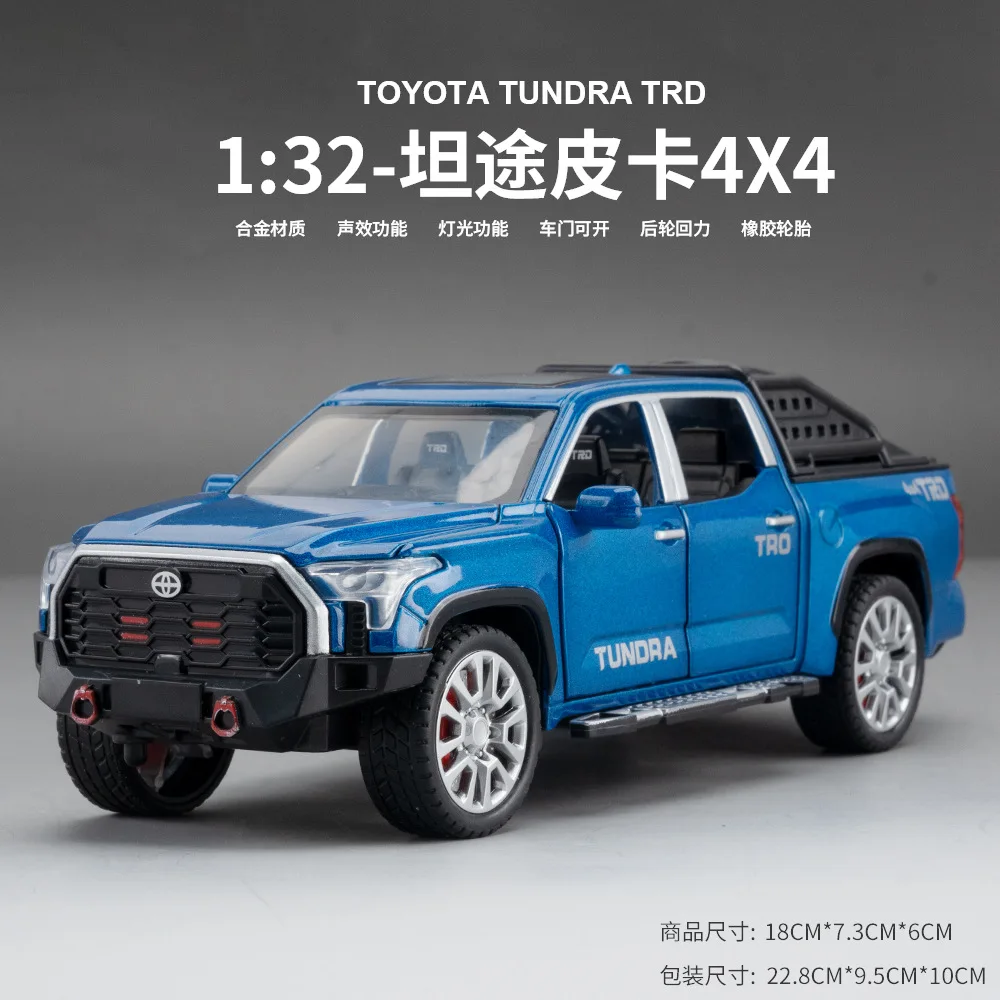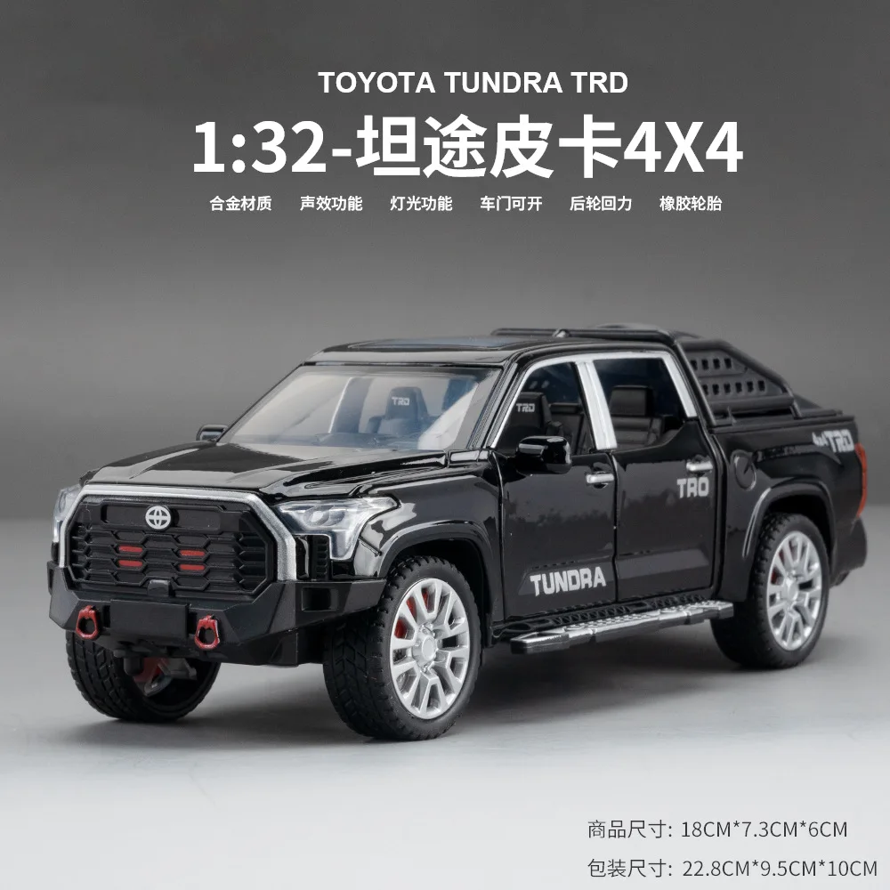 This 1:32 scale diecast alloy off-road car model embodies rugged style with bold design elements, including a black matte finish, honeycomb-patterned grille with red accents, LED-style headlights, textured bumpers with red tow hooks, and detailed silver multi-spoke rims on off-road tires. Decorated with “TUNDRA,” “TRD,” and “4×4” decals, it features a roof-mounted spare tire in a black cover and silver side steps, creating an authentic off-road aesthetic. Equipped with force control, flash lighting, and music/vocalization functions, this non-electric collectible is perfect for ages 14 and up, offering a striking display piece or engaging toy for off-road enthusiasts.