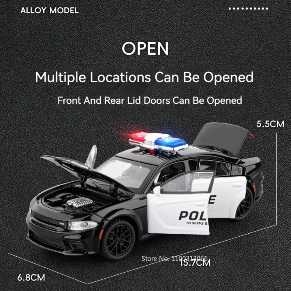 Experience realistic detail with this 1:32 scale diecast police car model, crafted from zinc metal with a durable alloy finish, featuring a sleek black body with a contrasting white side panel displaying bold “POLICE” lettering. The model measures approximately 15.7 x 6.8 x 5.5 cm, with six functional doors that open, equipped with light and sound features, and a pull-back mechanism for engaging play. It also includes rubber tires with a lifelike multi-spoke design and detailed body lines, vents, and air intakes for added realism. Suitable for collectors and enthusiasts aged 14 and above, this high simulation vehicle combines sturdy construction with striking visual appeal for educational or display purposes.