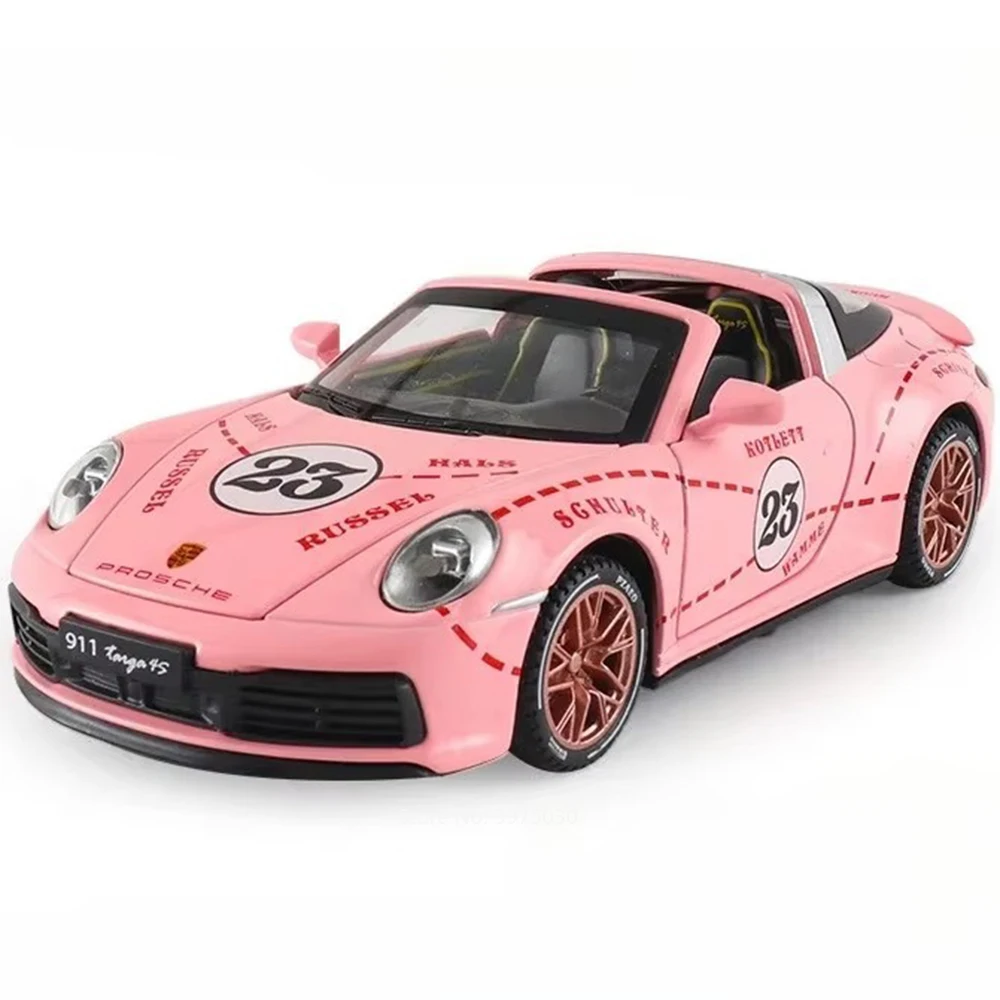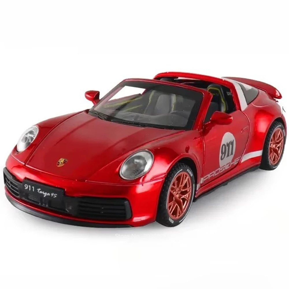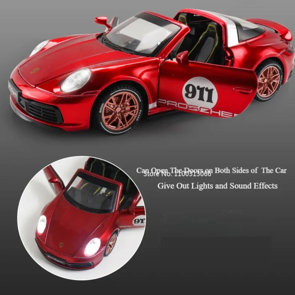 Imagine owning a stunning miniature replica of a Porsche 911 Targa 4S or Turbo S, perfectly designed to emulate the elegance and sporty appeal of the real vehicle. With a glossy, vibrant finish, the model’s sleek body reflects light beautifully, showcasing smooth contours, a sculpted front hood, and rounded headlamps that emphasize aerodynamic finesse. The meticulously crafted details, such as the black grille, realistic door handles, side mirrors, multi-spoke wheel rims, and tinted windows, add an authentic touch. Its durable zinc metal body combined with plastic chassis and rubber tires provides sturdiness and realism. Designed for collectors and enthusiasts, this small-scale masterpiece offers functionality with openable doors, sound, light features, and a pull-back mechanism for easy mobility, making it an irresistible addition to any collection.