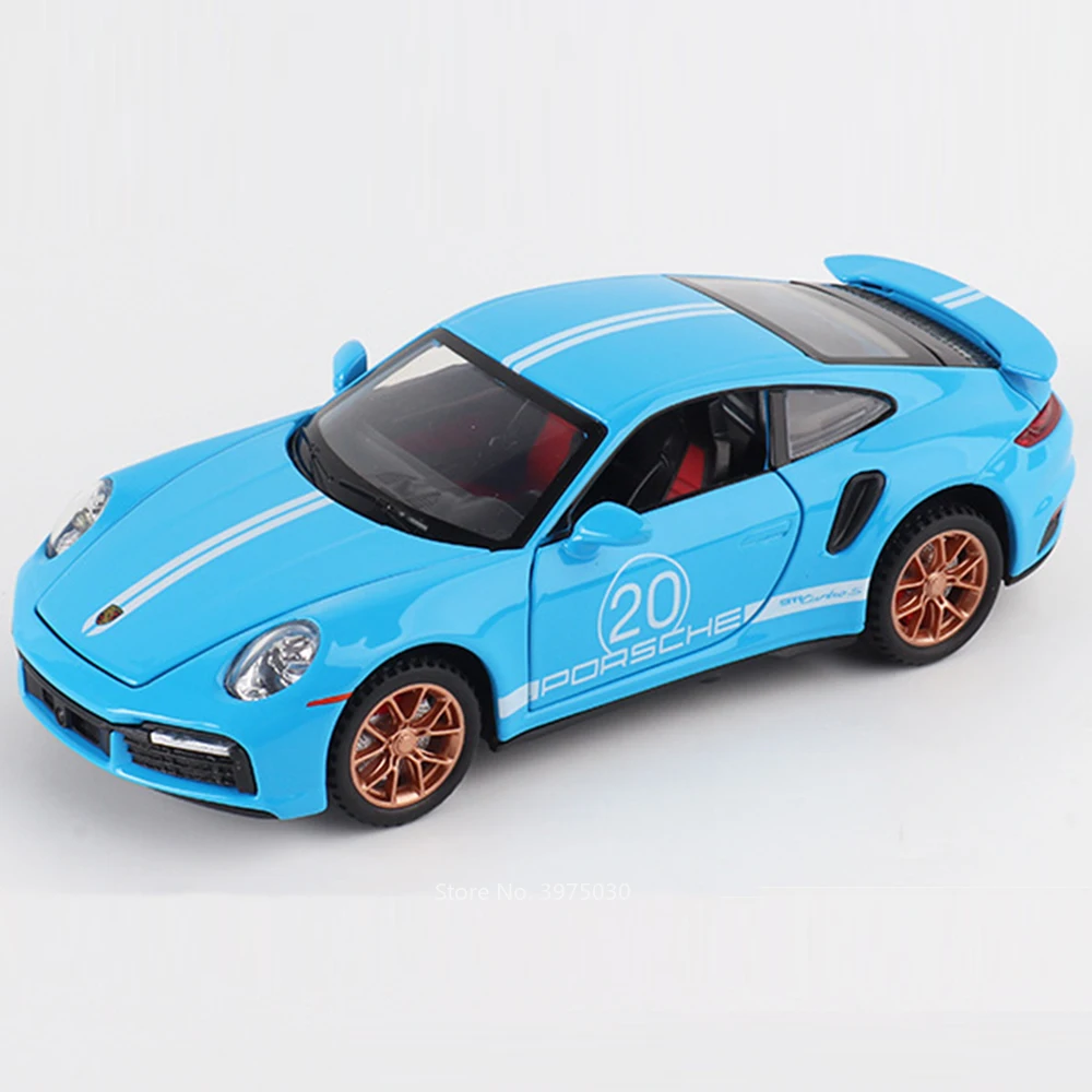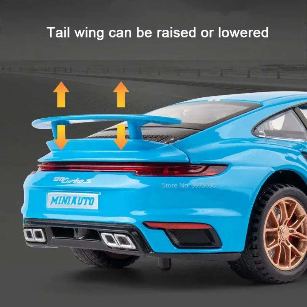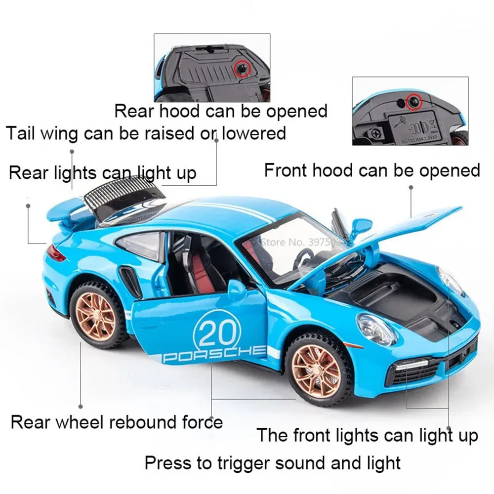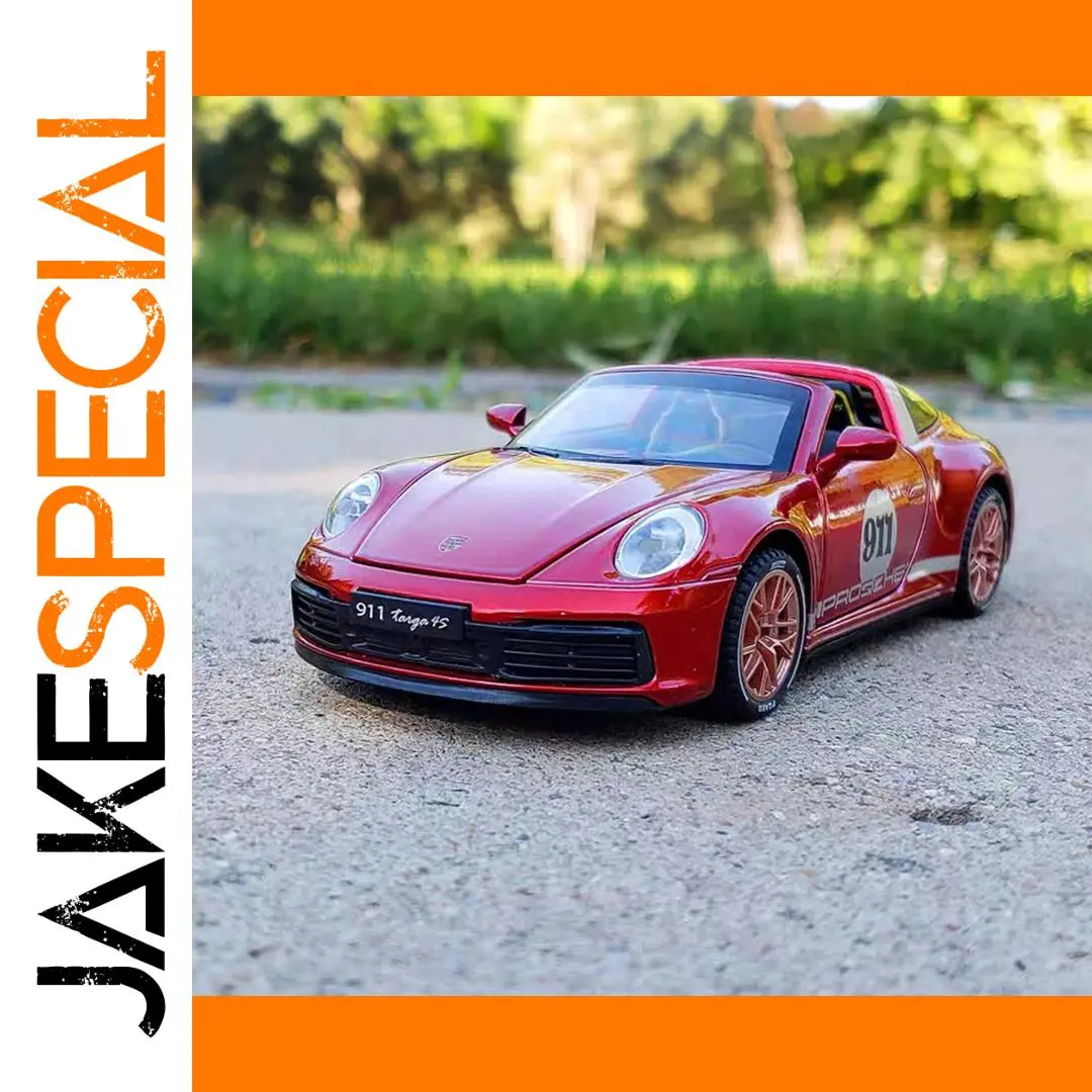 Imagine owning a stunning miniature replica of a Porsche 911 Targa 4S or Turbo S, perfectly designed to emulate the elegance and sporty appeal of the real vehicle. With a glossy, vibrant finish, the model’s sleek body reflects light beautifully, showcasing smooth contours, a sculpted front hood, and rounded headlamps that emphasize aerodynamic finesse. The meticulously crafted details, such as the black grille, realistic door handles, side mirrors, multi-spoke wheel rims, and tinted windows, add an authentic touch. Its durable zinc metal body combined with plastic chassis and rubber tires provides sturdiness and realism. Designed for collectors and enthusiasts, this small-scale masterpiece offers functionality with openable doors, sound, light features, and a pull-back mechanism for easy mobility, making it an irresistible addition to any collection.