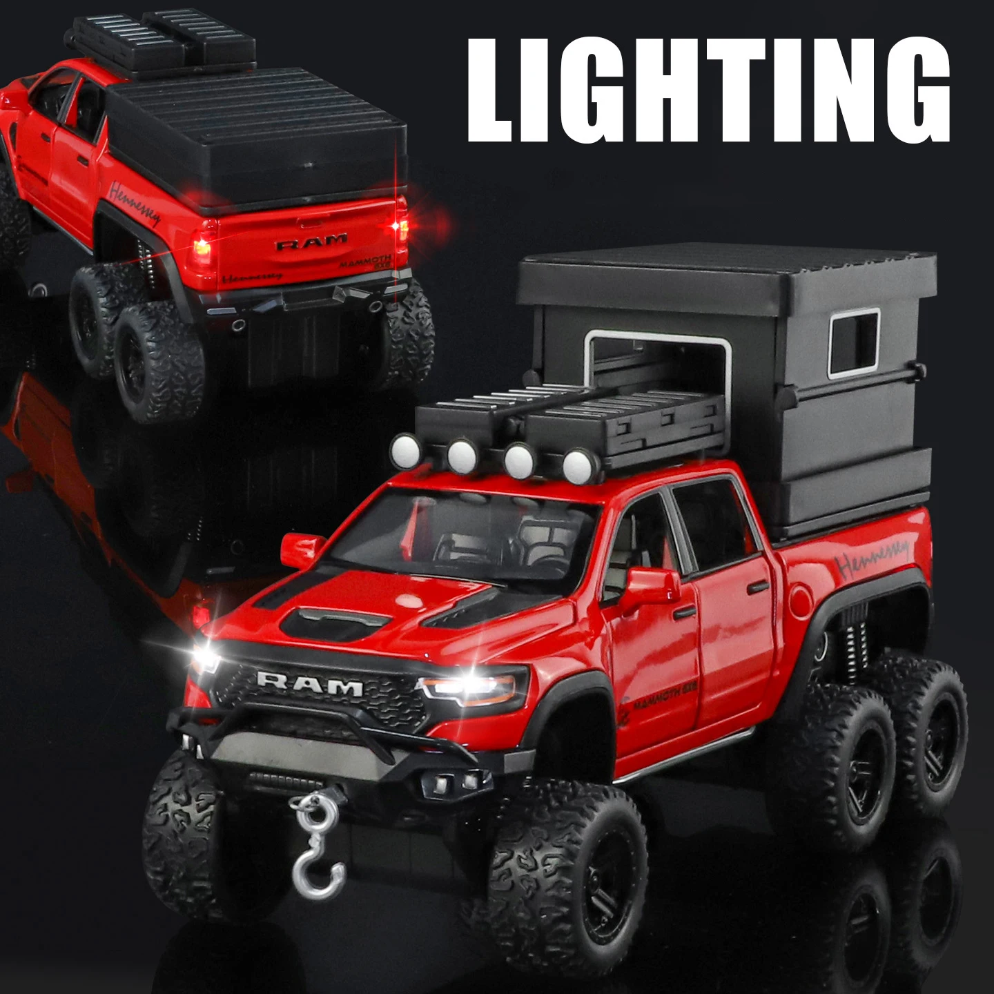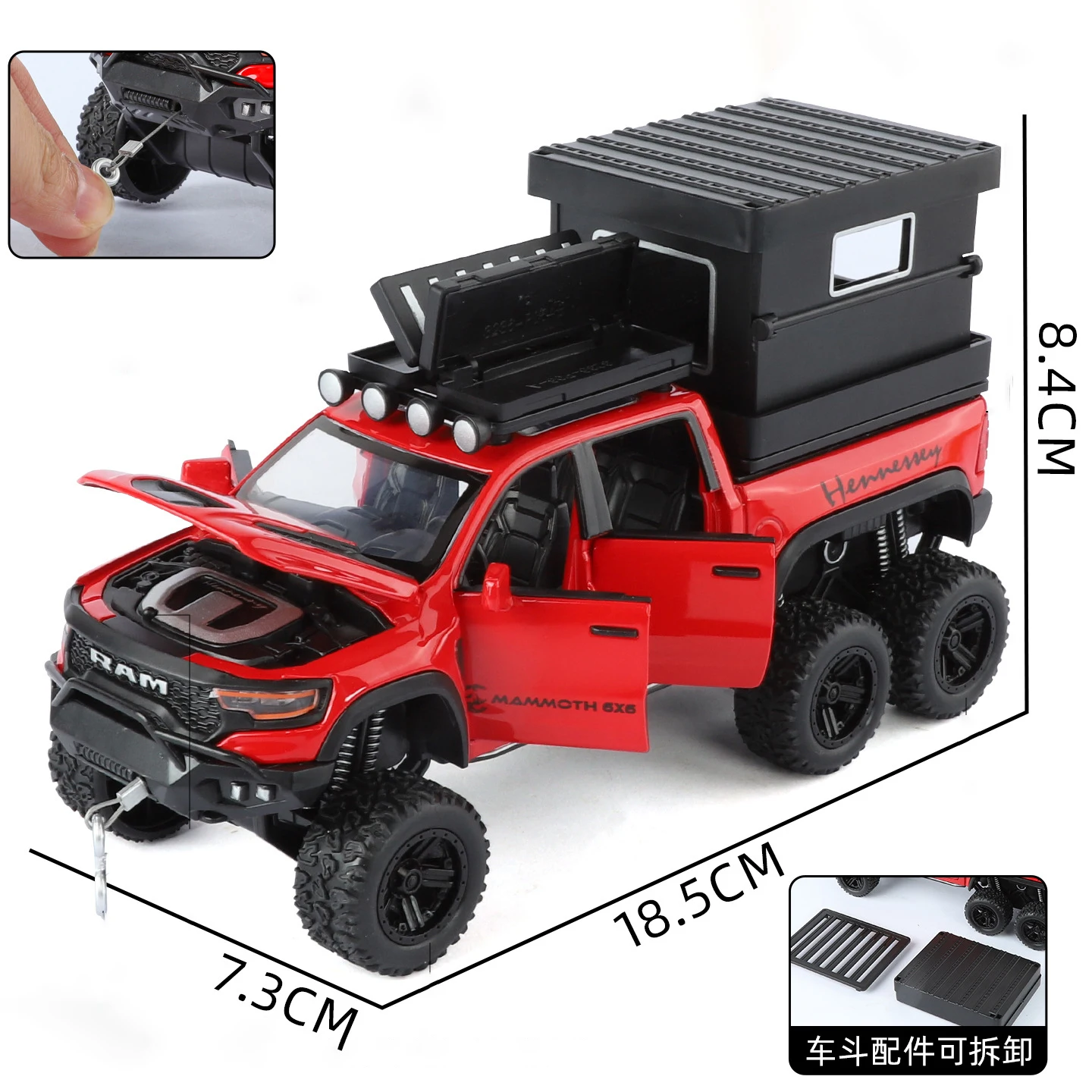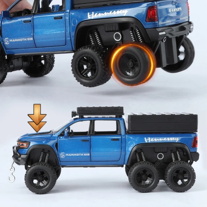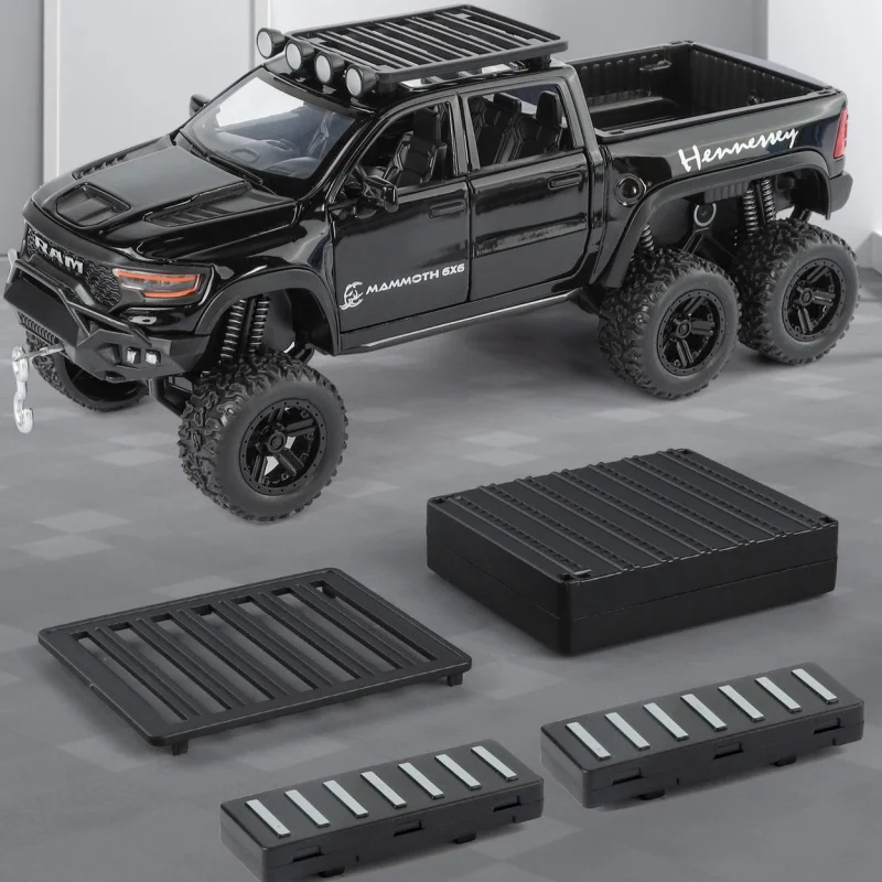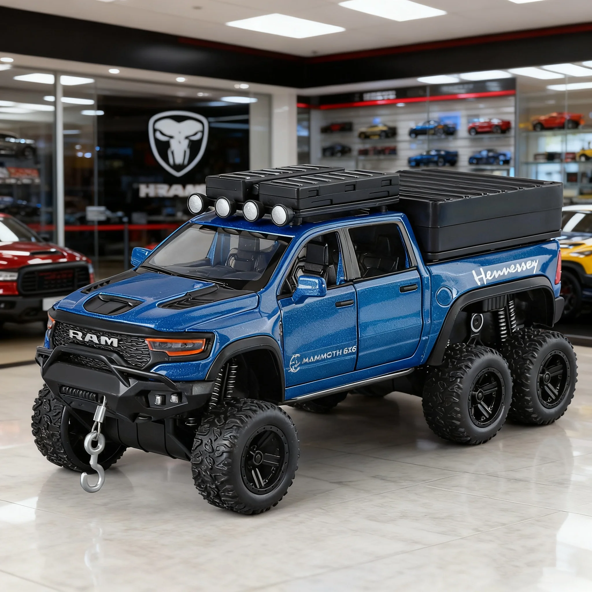 Step into the world of rugged adventure with this highly detailed 1:32 scale diecast model of the RAM 1500 TRX 6×6 RV. Crafted from alloy and plastic, it combines durability with an authentic appearance. Its sleek, glossy black finish highlights intricate design elements such as a sturdy front grille, LED-style headlights, a spacious cargo box, and auxiliary lights mounted on a roof rack—perfect for off-road enthusiasts. The model’s precise craftsmanship captures realistic details like side mirrors, door handles, and decals including “Mammoth 6X6” and “Hennessee,” emphasizing its adventurous spirit. Available in black, blue, and red, it perfectly balances aesthetic appeal with robustness, making it an ideal display piece or gift for collectors and hobbyists alike.