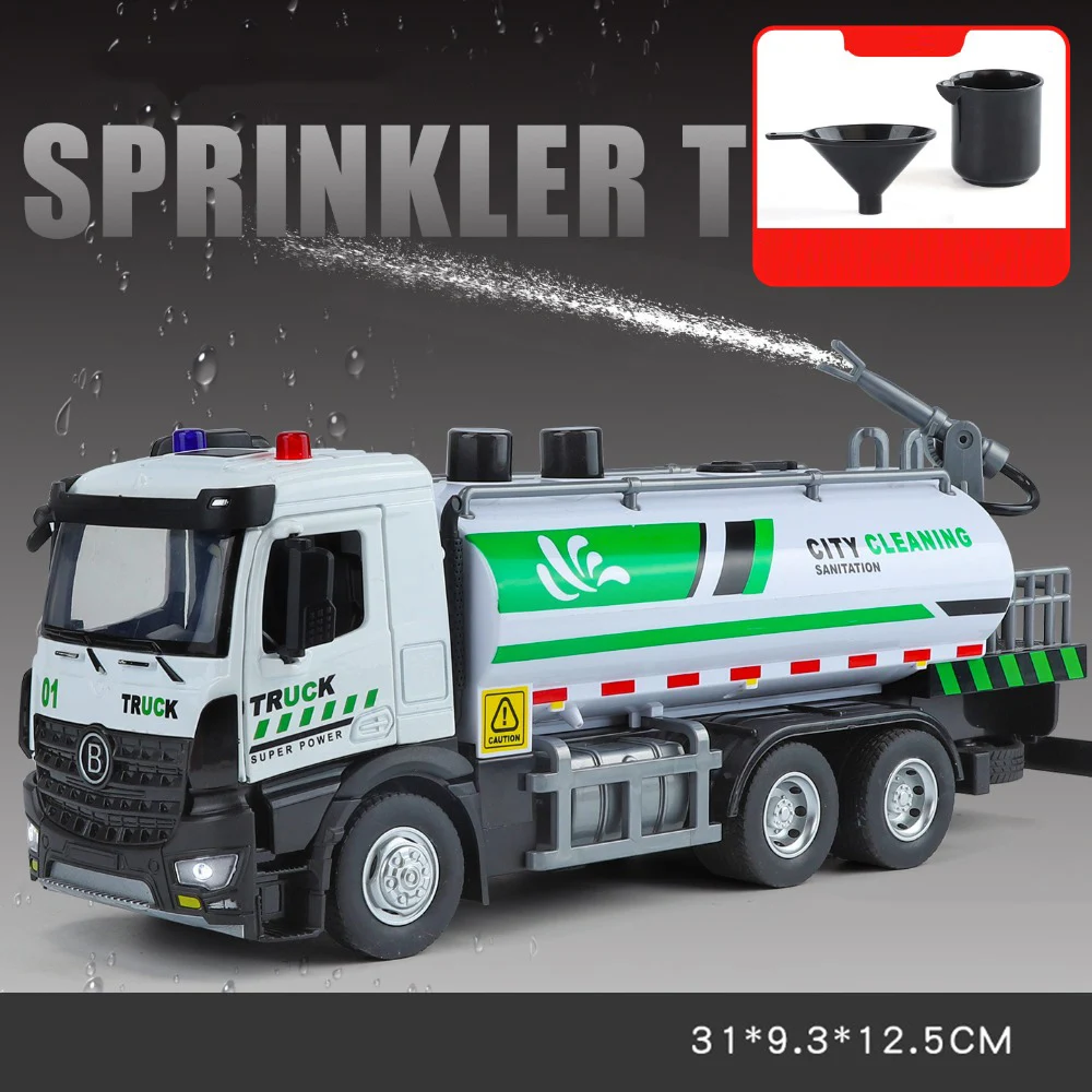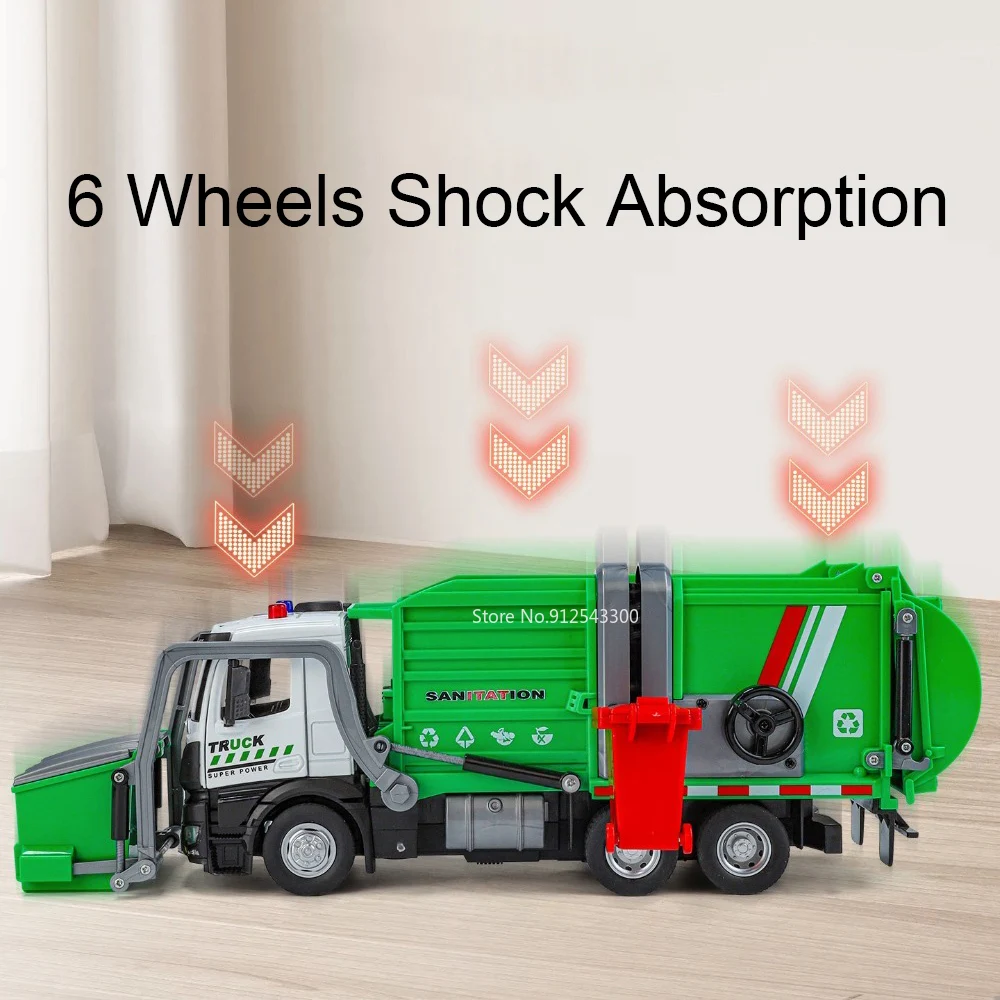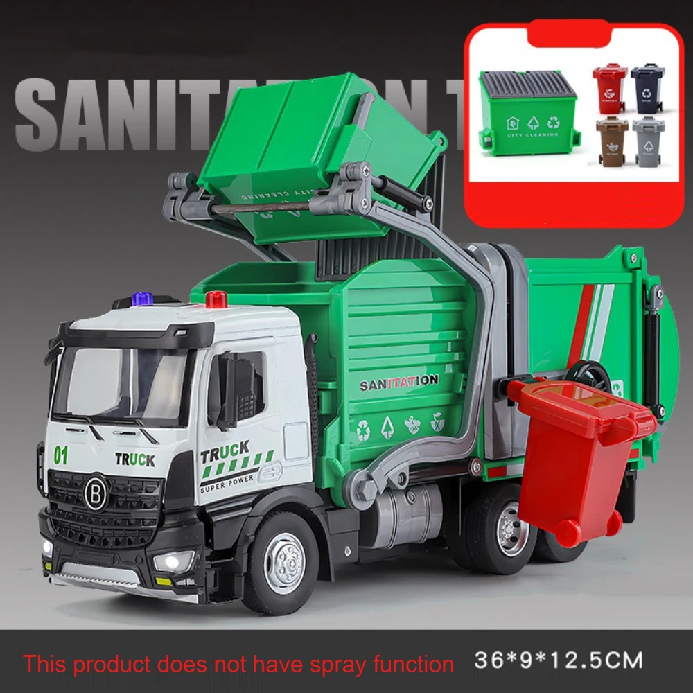 Step into the world of urban waste management with this highly detailed 1:32 scale model toy garbage truck. Crafted with a durable metal body, plastic chassis, and rubber tires, it offers exceptional realism and sturdiness. The bright green main body is decorated with graphic recycling symbols and bold “SANITATION” lettering, enhancing its visual appeal. The white cab features sleek black accents, clear windshields and windows, and tiny details like windshield wipers and roof lights for added authenticity. The large gray mechanical arm extends effortlessly, mimicking real-life functionality. With sound and light effects, a pull-back mechanism, opening doors, and shock absorption, it’s perfect for immersive play or display. This reliable, detailed model brings urban cleanup to life.